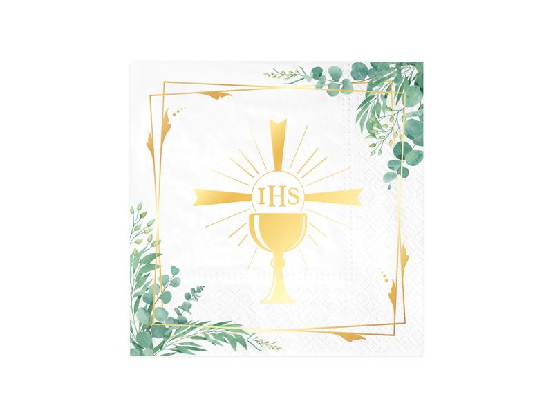 Serwetki w kolorze białym z motywem na Komunię Świętą w kolorze białym "Kielich IHS". W opakowaniu znajduje się 10 sztuk serwetek o rozmiarze 33 cm x 33 cm. Idealnie nadają się na przyjęcia komunijne, aby dodać akcent elegancji.