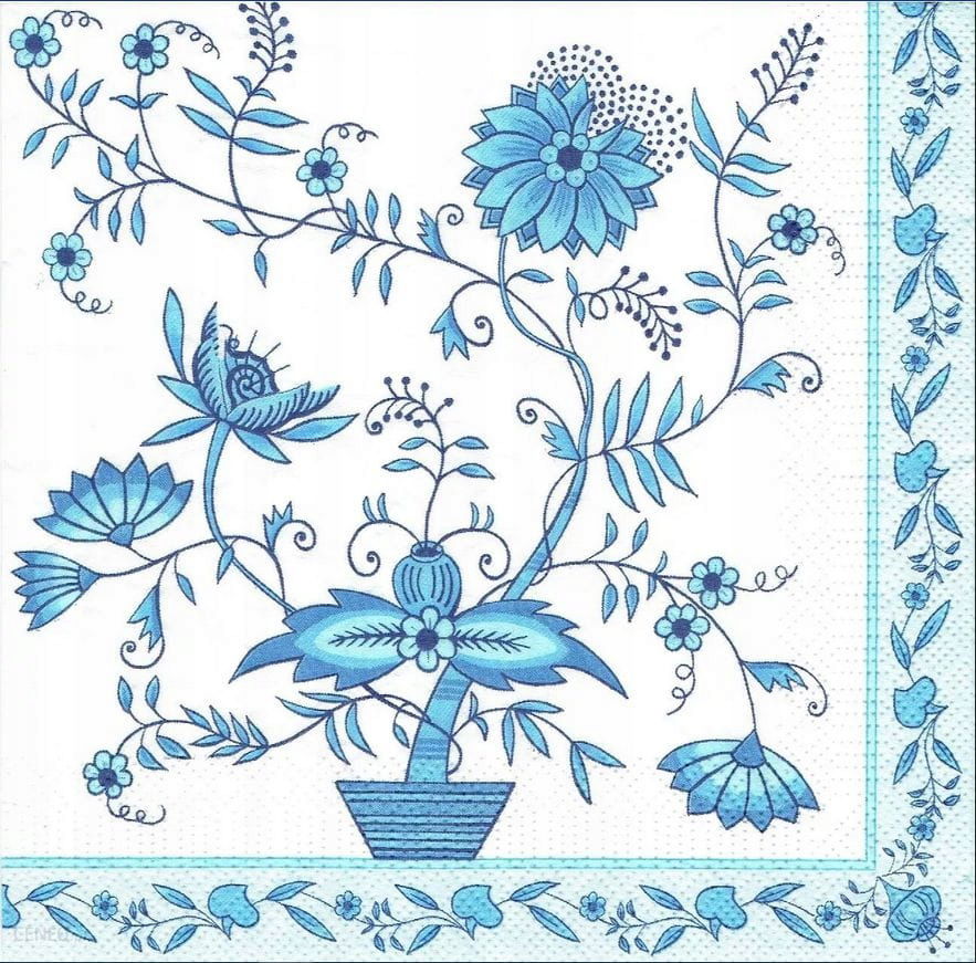 Serwetki papierowe folk zwany Blue Onion Paczka zawiera 20 szt. Serwetki, są trójwarstwowe z kolorowym nadrukiem błękitnych kwiatów. Świetnie nadają się jako ozdoba na stół, wykorzystywane są również przez rękodzielników do decoupage. Wzór pochodzi z ceramiki o takiej samej nazwie. Motyw niebieskich kwiatów wygląda bardzo elegancko i świetnie prezentuje się na stole. Wymiary: 16,5 x 16,5 cm