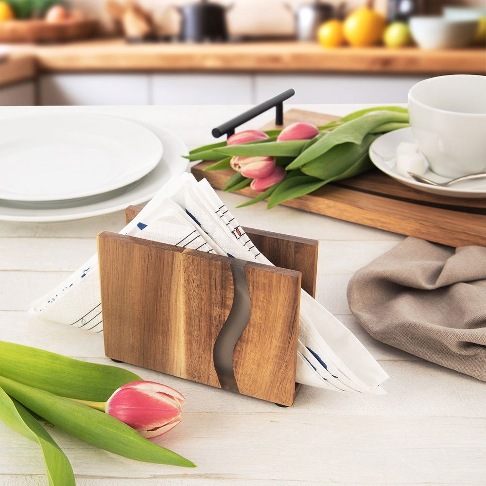 Wykonany z drewna akacjowego - Stojak na serwetki wykonany jest z naturalnego drewna akacjowego z elementami żywicy, która jest osadzona w drewnie, a swoim kształtem przypomina rzekę. Drewno akacjowe, jest materiałem ekologicznym i bezpiecznym dla zdrowia.