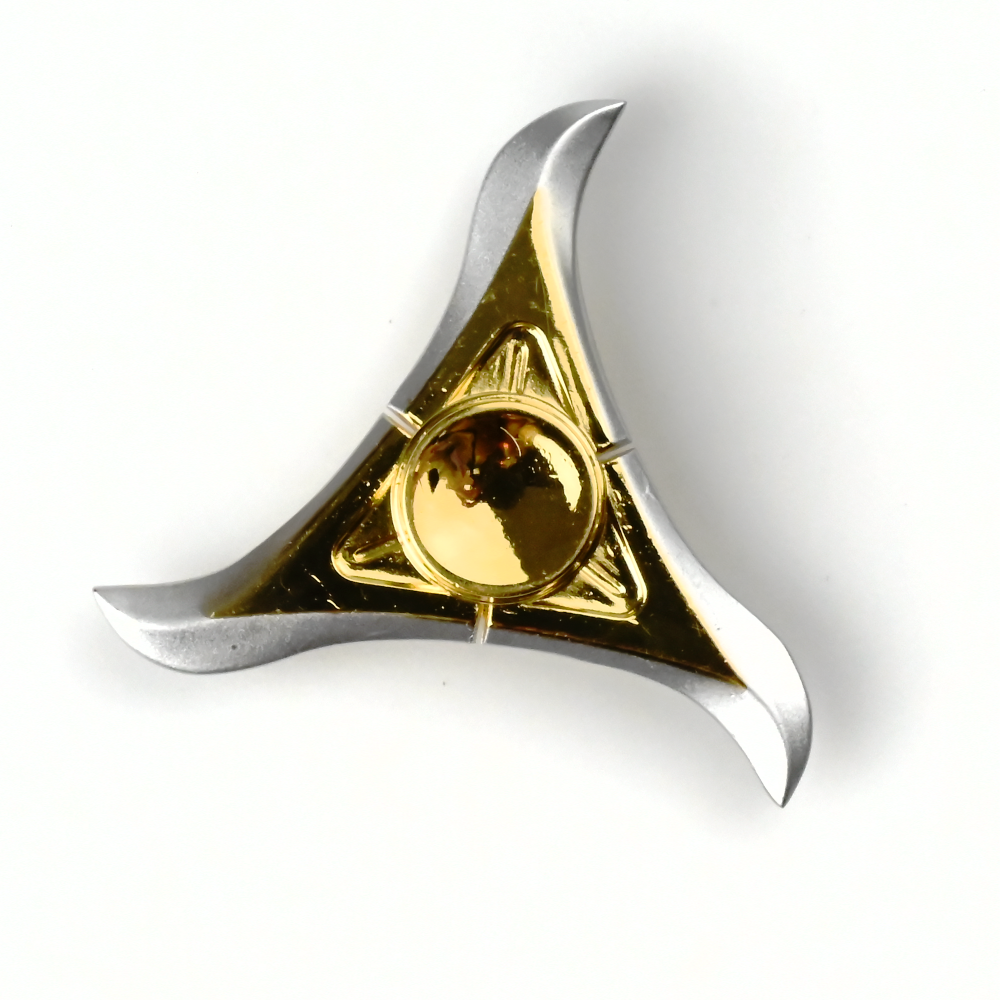 Wykonany z metalu i w rozmiarze 8 cm, wygodnie leży w dłoni i daje satysfakcjonujące, „premium” wrażenie dzięki swojej wadze. Trzy zakrzywione, półksiężycowate ostrza rozchodzą się od okrągłego środka z łożyskiem, a całość ma mocny, dwukolorowy wygląd: jasne srebro na zewnętrznych krawędziach i lustrzane złoto na wewnętrznych, trójkątnych panelach oraz wypukłej kopułce pośrodku. Delikatne fazowania i czyste linie tworzą ostry, „techniczny” kształt, a błyszczący środek pięknie łapie światło przy każdym ruchu. Widoczne, pierścieniowe łożysko w centrum sprzyja płynnym obrotom i pewnemu chwytowi między palcami. Cały design przywołuje styl shurikenów i kunai znany z ekranu — elegancki, dynamiczny i od razu rozpoznawalny dla fanów. Jako kolekcjonerski Shuriken świetnie pasuje na półkę, obok stanowiska do pracy albo jako prezent dla kogoś, kto żyje klimatem anime. Postaw go przy klawiaturze na spotkania i naukę albo potraktuj jako dyskretny rekwizyt do ninja-inspirowanego outfitu — a metalowe wykończenie wygląda świetnie nawet, gdy po prostu leży i czeka na kolejny „flick”.