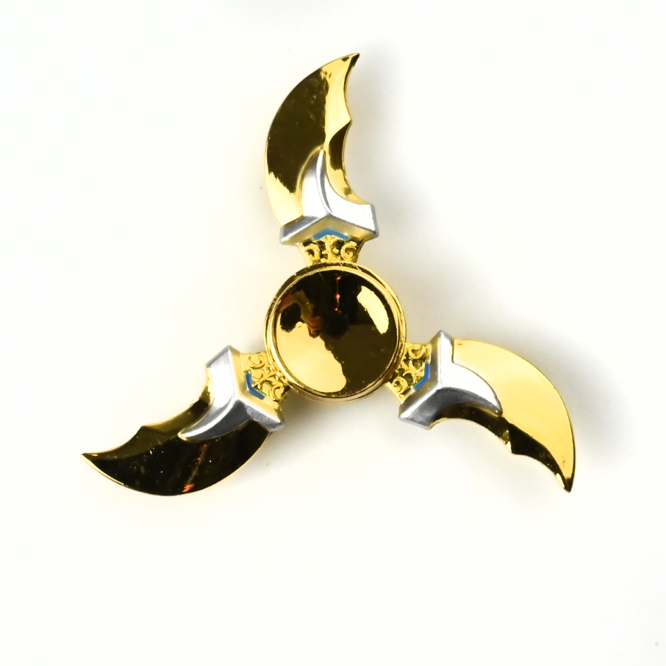 W świecie Naruto jeden błysk stali potrafi przesądzić o udanej ucieczce albo totalnej wtopie na misji — a ten Shuriken pozwala Ci mieć tę energię shinobi zawsze pod ręką. To propozycja dla fanów, którzy chcą czegoś, co wygląda świetnie na półce, a jednocześnie daje frajdę w użyciu — ma klimat ninja-gadżetu, ale w wersji “na biurko”. Przy 8 cm to spinner o wyraźnej, “do dłoni” wielkości, z trzema zakrzywionymi ramionami w dynamicznym, gotowym do ruchu kształcie. Metalowa konstrukcja sprawia, że czuć solidność i fajny, premium ciężar. Błyszczący, lustrzany złoty środek i złote panele odbijają światło jak małe trofeum, a srebrzyste krawędzie podkreślają krzywizny i dają mocny, dwukolorowy kontrast. Wokół piasty widać też wklęsłe, trójkątne detale, które dodają “rzeźbionego” charakteru. Kręć go dla płynnego, rytmicznego relaksu albo wystaw jako dyskretny ukłon w stronę sprzętu ninja znanego z ekranu — idealny do kolekcji i świetny na prezent dla fana Naruto.