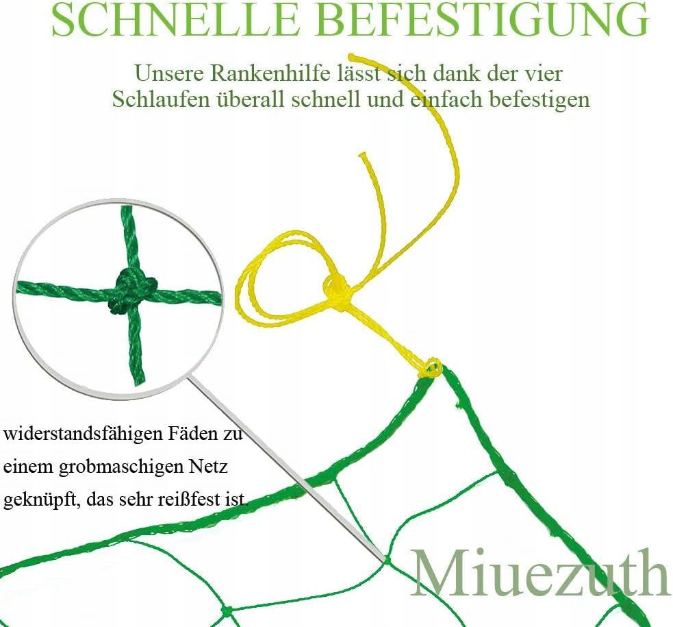 Instalacja siatki Miuezuth jest niezwykle prosta i intuicyjna. Można ją łatwo przymocować do wbitych w ziemię słupków pionowo lub ukośnie. Dzięki czterem elastycznym pętlom mocującym, montaż jest możliwy wszędzie – zarówno wewnątrz szklarni, jak i na otwartej przestrzeni. Siatka idealnie dopasowuje się do każdej przestrzeni, niezależnie od jej wielkości, zapewniając natychmiastową pomoc wertykalnego wzrostu dla roślin.