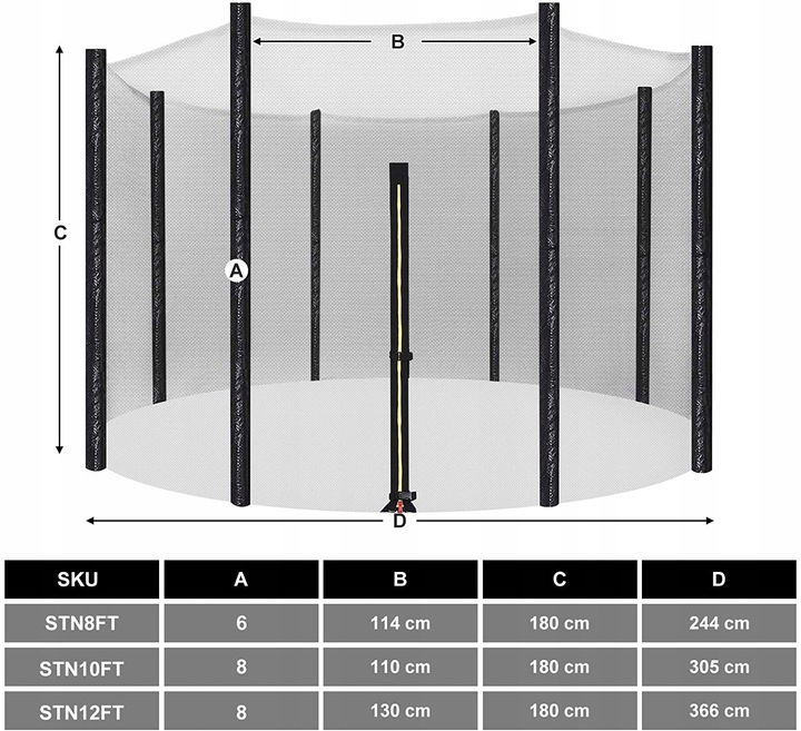 [Ważne wskazówki dotyczące odpowiednich trampolin] Ta siatka zabezpieczająca pasuje do trampolin o średnicy 366 cm z ośmioma prostymi drążkami mocującymi o wysokości 1,8 m o średnicy mniejszej niż 6,5 cm, które można umieścić w pokrowcach ochronnych siatki