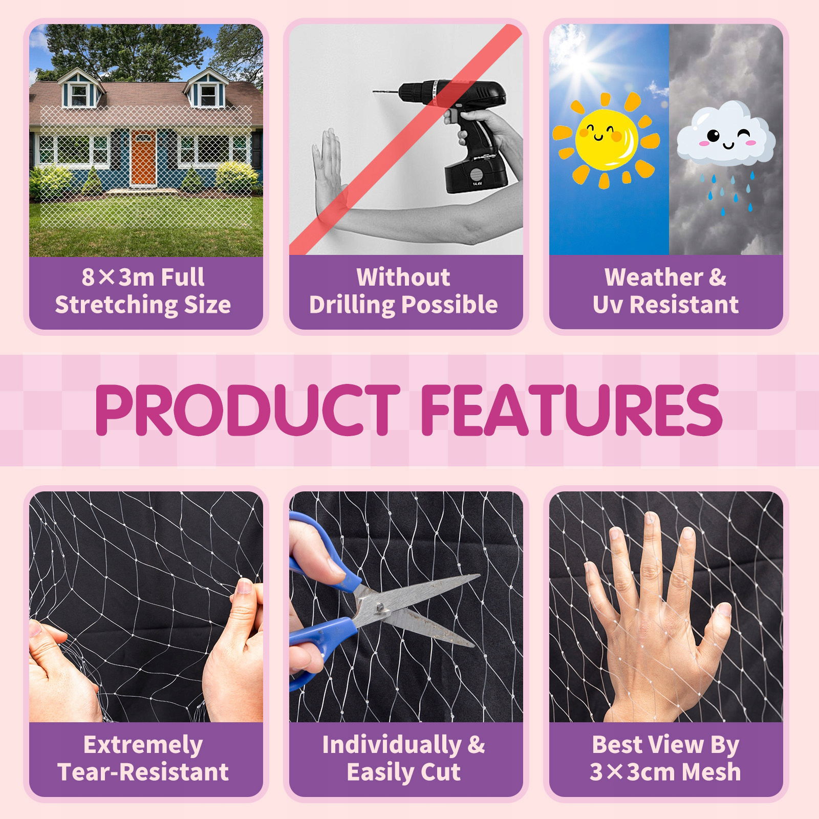 - Zawartość zestawu: siatka 8 × 3 m, 20 opasek kablowych, 20 haczyków samoprzylepnych, 20 haczyków, linka 25 m, instrukcja obsługi