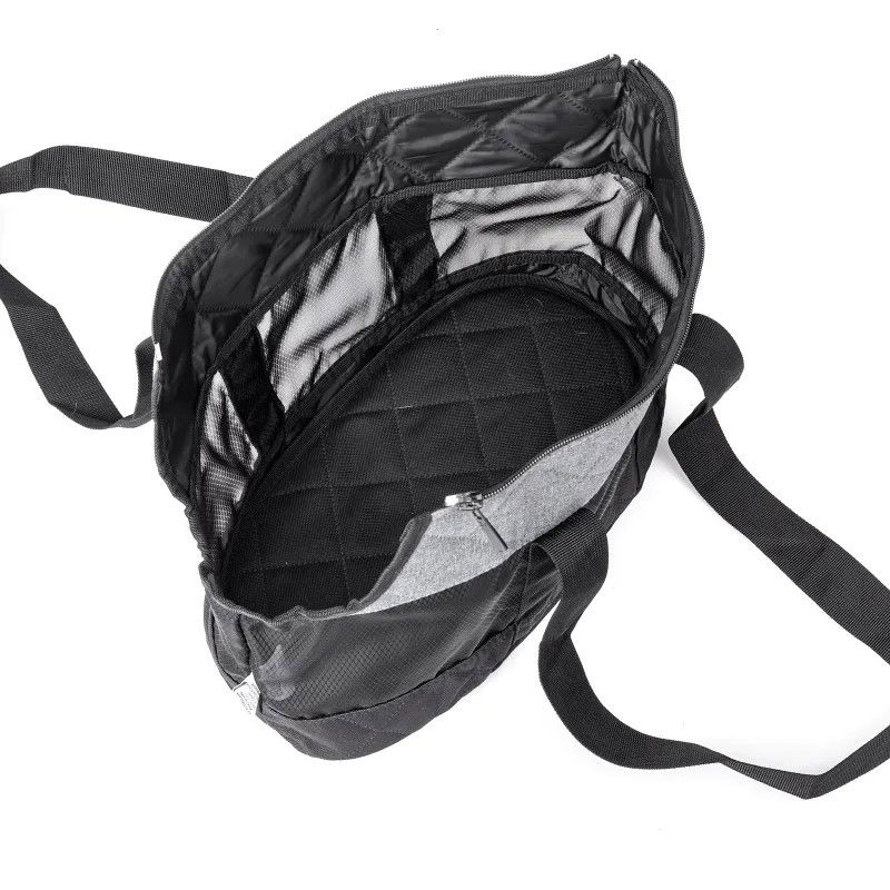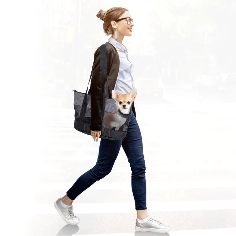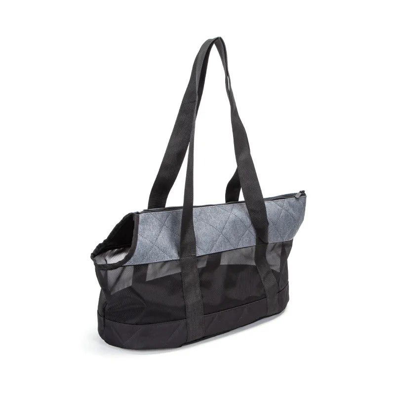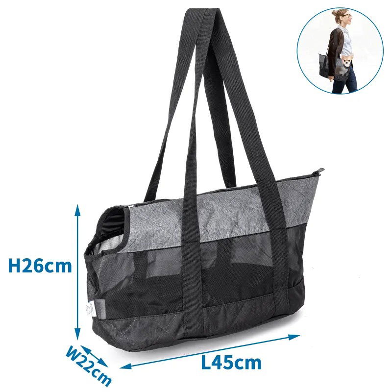 Siatkowa czarna torba podróżna dla zwierząt, którą można nosić na ramieniu lub w ręce, łatwa w użyciu.