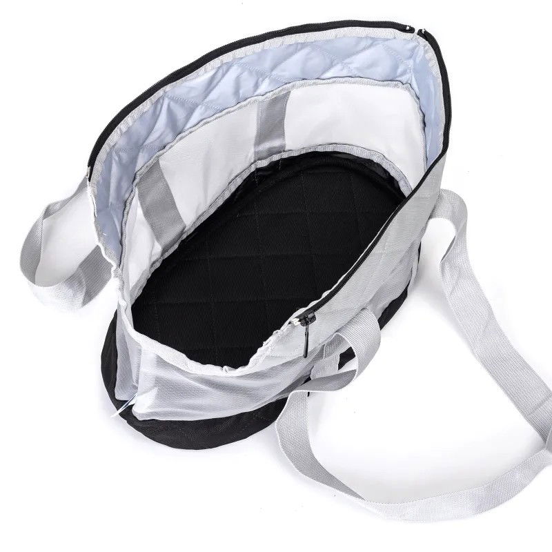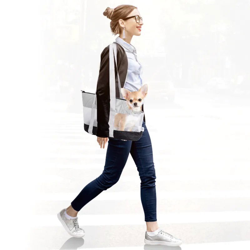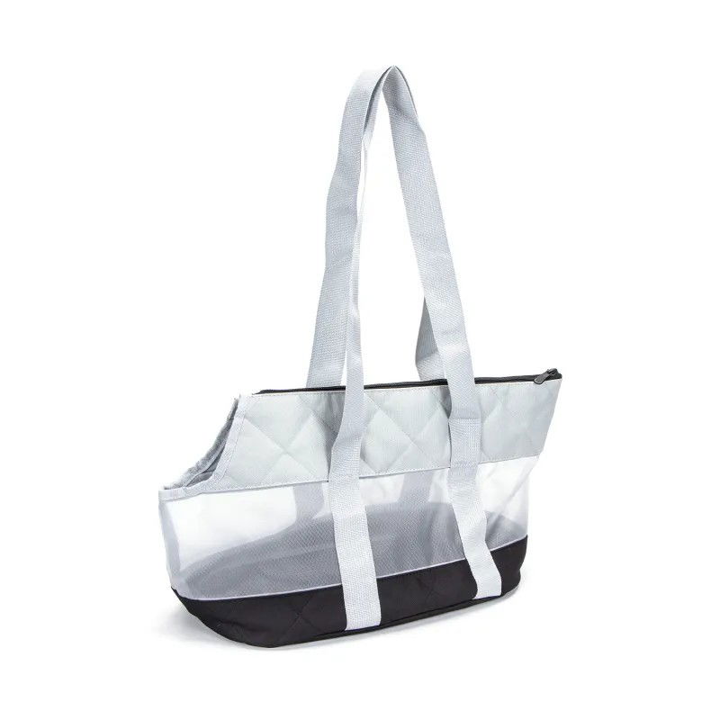 Siatkowa jasno szara torba podróżna dla zwierząt, którą można nosić na ramieniu lub w ręce, łatwa w użyciu.