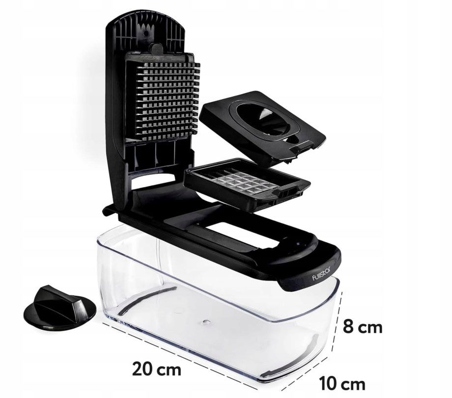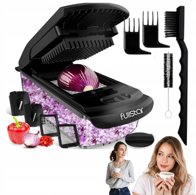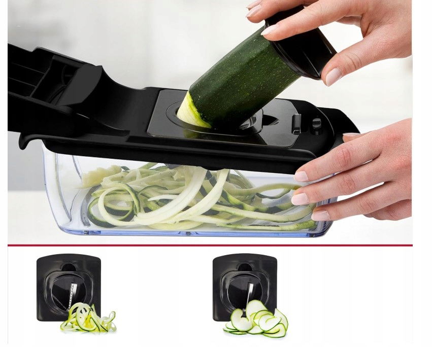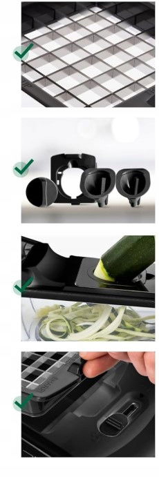 Zestaw łączy cztery różne funkcje krojenia w jednym urządzeniu. Umożliwia szybkie przygotowanie składników bez konieczności użycia wielu narzędzi kuchennych.