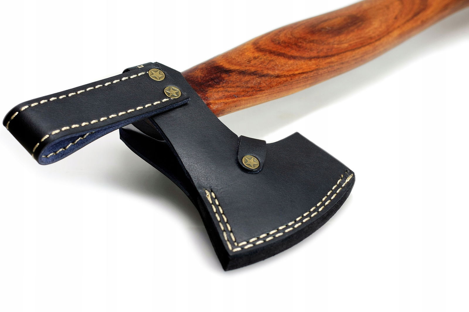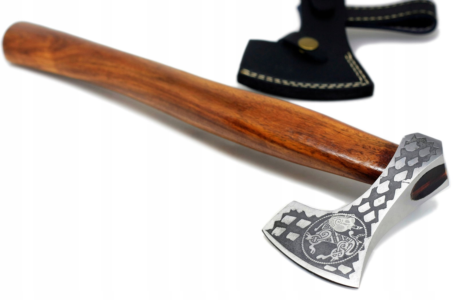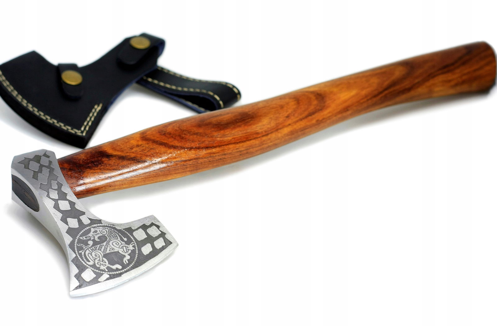 Ręcznie wykonany topór / siekiera, ostrze wykonane z najwyższej jakości stali wysokowęglowej dzięki czemu utrzymuje swoje właściwości tnące przez długi czas bez konieczności ostrzenia, idealnie nadaje się na zewnątrz - polowanie, ryby, camping, wyprawy survivalowe. Rękojeść wykonana z drewna różanego. Pokrowiec z naturalnej skóry cielęcej zapewnia idealną ochronę ostrza.