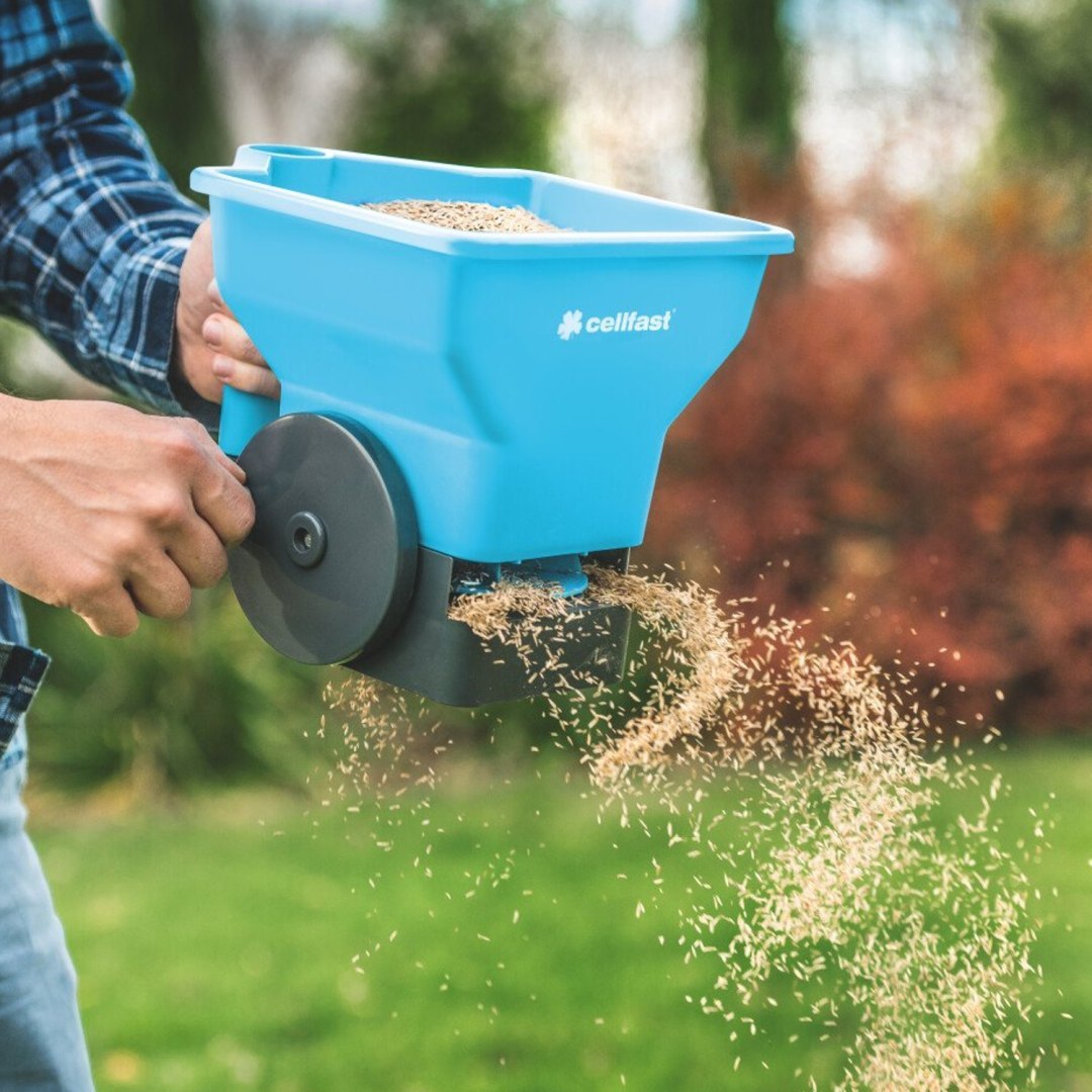 Wysokiej jakości siewnik ręczny Cellfast przeznaczony do rozsiewania trawy lub nawożenia, niezbędny również zimą podczas posypywania oblodzonych chodników piaskiem lub solą. Wyposażony obrotową korbkę, dzięki której można w łatwy sposób kontrolować i dozować jego dawki w zależności od granulacji i zapotrzebowania.