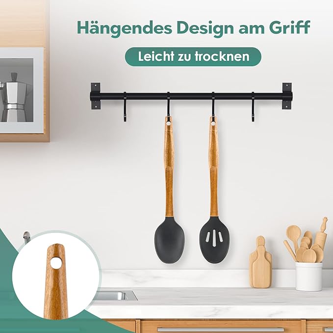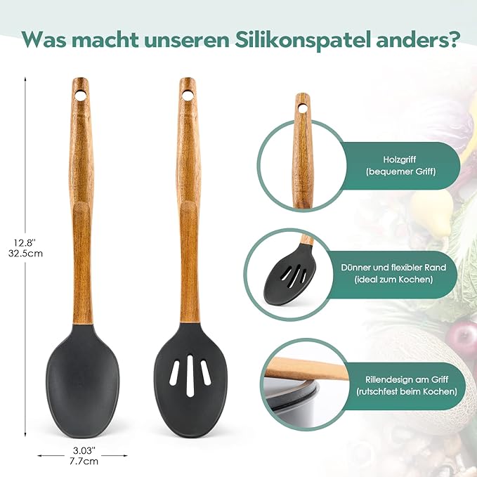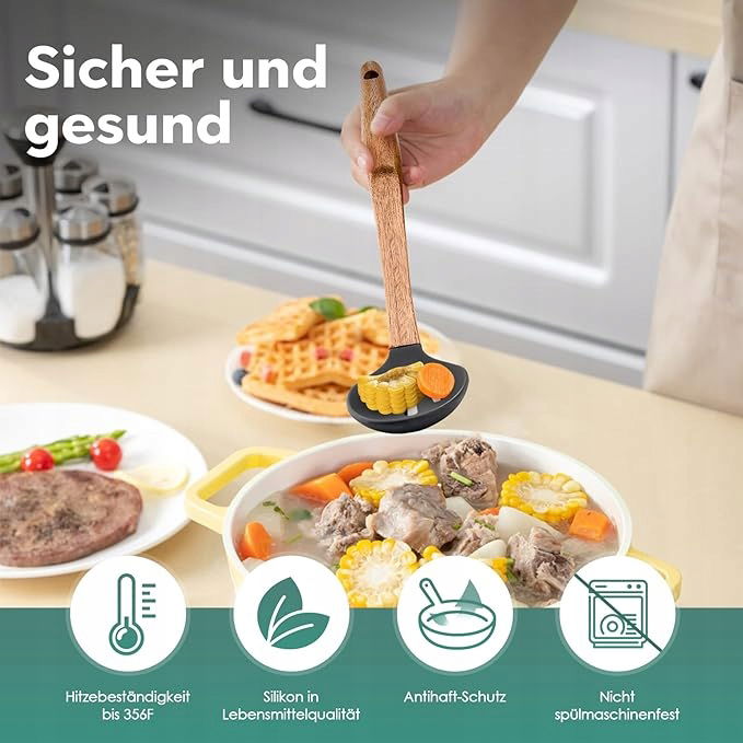 Zdrowie i bezpieczeństwo Nasza silikonowa szpatułka do gotowania jest wykonana z silikonu przeznaczonego do kontaktu z żywnością (nie zawiera BPA), więc nie musisz się martwić o stopienie lub odkształcenie nawet w temperaturze 446 ℉ (230 ℃). Jednocześnie miękka silikonowa główka nie rysuje powłoki podczas gotowania i lepiej chroni garnki i patelnie.