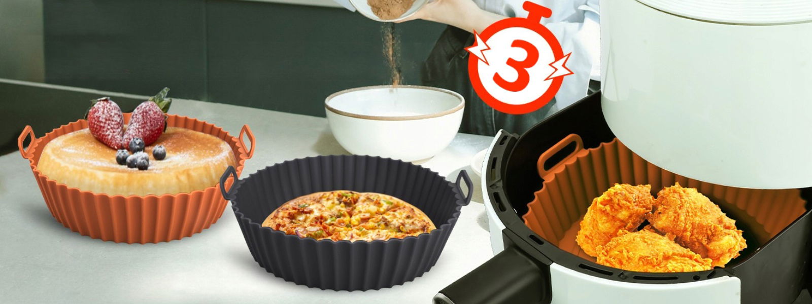 ✅3 silikonowe foremki do frytkownicy w kolorze czerwonym, zielonym i niebieskim.