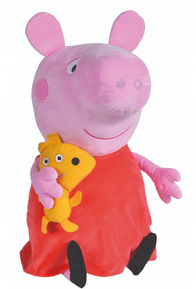 Maskotka pluszowa z wizerunkiem świnki Peppy trzymającej pieska w ręku. Maskotka wykonana z wysokiej jakości, miękkiego pluszu. Zabawka z bezpiecznymi, szytymi oczami. Wierne odwzorowanie postaci.