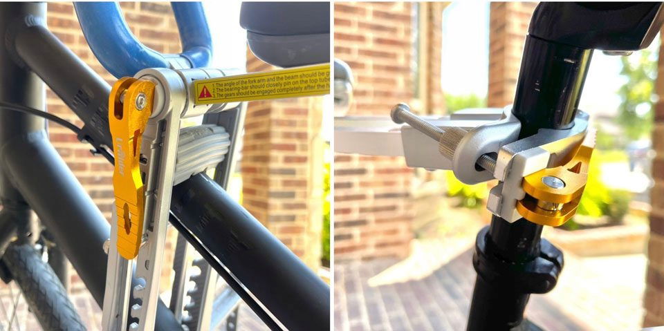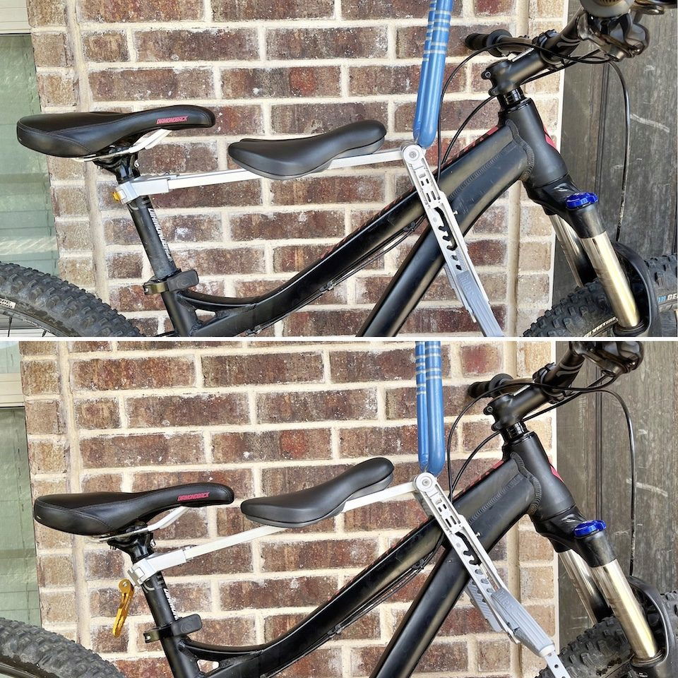 Część siodełka, na której spoczywa ciężar, znajduje się na ramie roweru, gdzie z przodu siodełka znajduje się gumowy drążek podtrzymujący, który opiera się na górnej rurze. Tylny zawias otacza sztycę siodełka i jest najpierw dokręcany ręcznie, a następnie zabezpieczany dźwignią szybkiego zwalniania.
