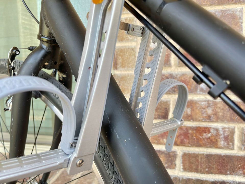 Rower ma dwa punkty kontaktu. Gumowy wspornik opiera się na ramie roweru i można go regulować w górę i w dół, aby dopasować go do różnych typów ram roweru. Tylny zawias otacza sztycę siodełka i mocno zabezpiecza UrRider na miejscu. Dwa punkty styku roweru z UrRiderem - przedni drążek nośny jest gumowany, zawias tylnej sztycy posiada mechanizm szybkiego zwalniania