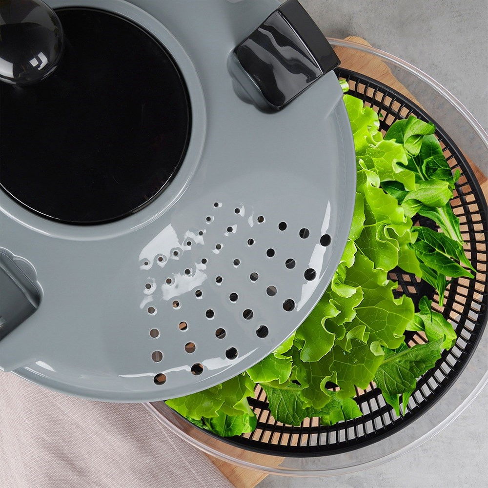 Szybkie osuszanie sałaty - Wirówka pozwala na błyskawiczne osuszenie sałaty, dzięki czemu można szybko przygotować świeże i chrupiące sałatki. W ciągu kilku sekund pozbędziemy się nadmiaru wody i uzyskamy chrupiącą sałatę. Pokrywka zawiera otwory, które pozwolą w szybki sposób odlać wodę.