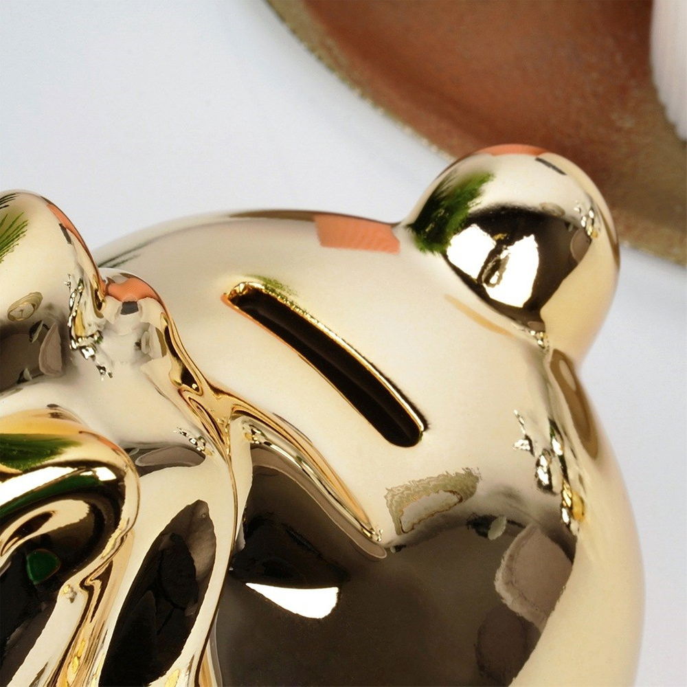 Wykonana z ceramiki z lustrzanym wykończeniem - Elegancka skarbonka wykonana z ceramiki pokrytej lustrzaną powłoką w złotym kolorze, która nadaje jej wyjątkowy blask i nowoczesny wygląd. Lustrzany połysk dodaje produktowi luksusowego wyglądu.