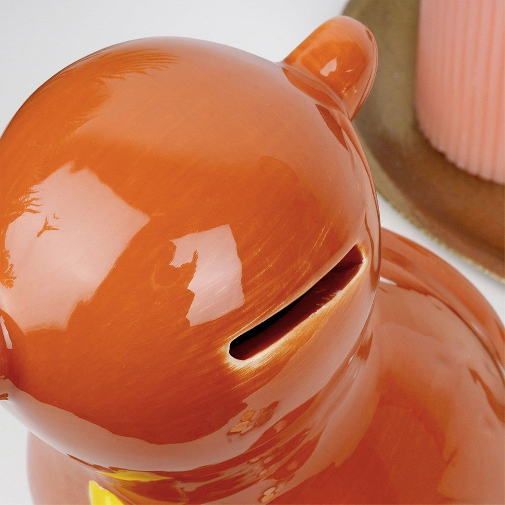 Wykonana z ceramiki pięknie malowana - Urocza skarbonka wykonana z ceramiki malowanej na pomarańczowy kolor.