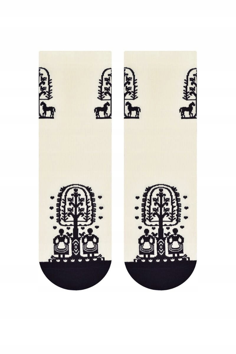 Skarpetki zdobione są tradycyjnymi motywami kurpiowskimi. Dominującym elementem jest drzewo życia otoczone dwoma końmi, które symbolizują płodność i życie. Na przedniej części skarpetek znajdują się dodatkowe elementy ludowe, charakterystyczne dla regionu Kurpii.