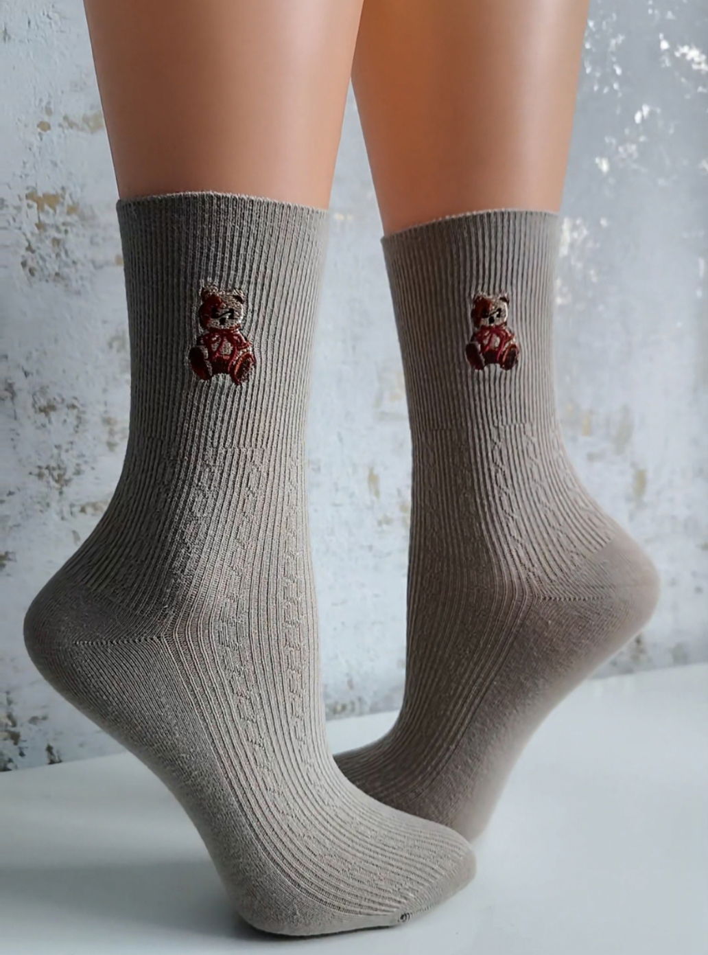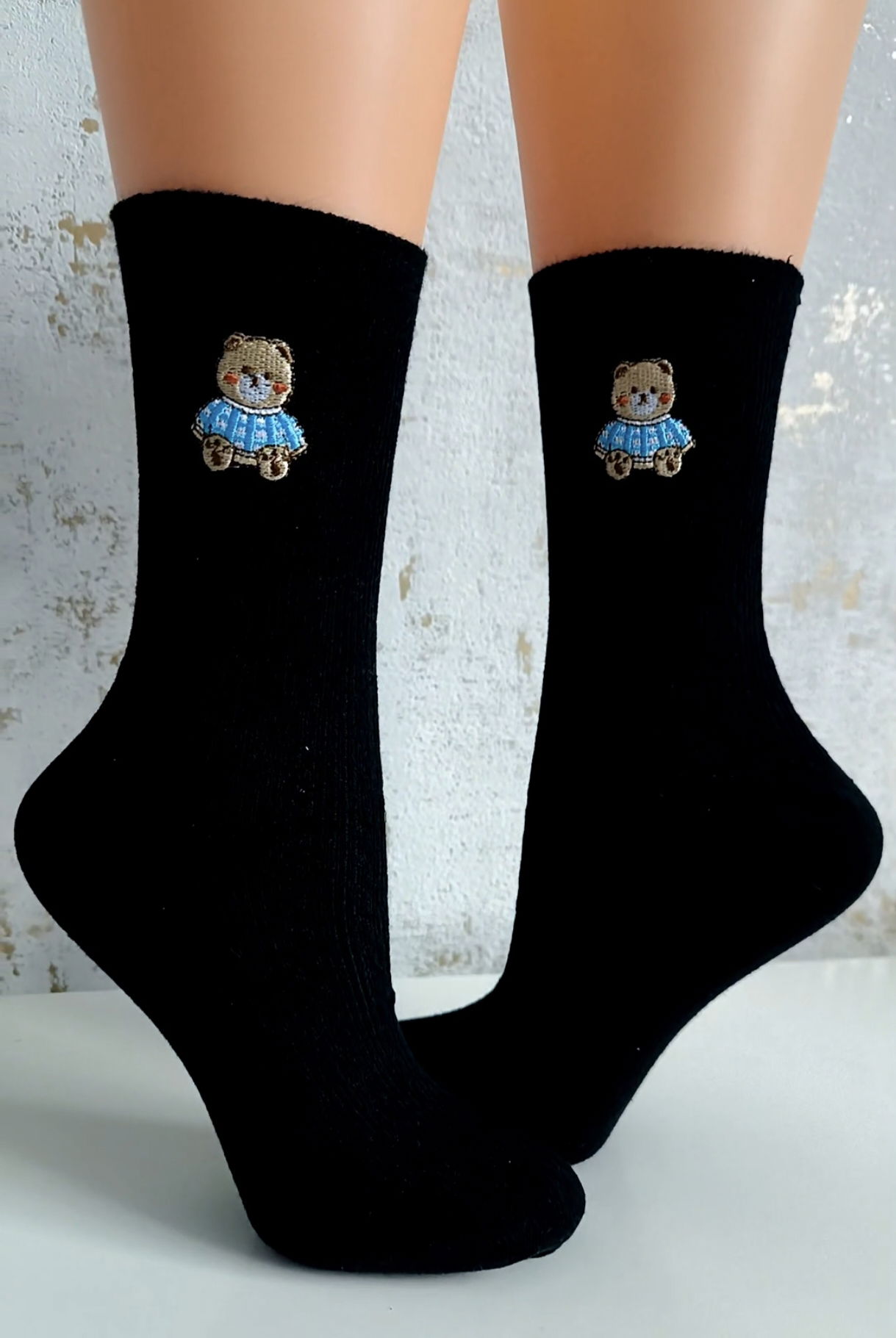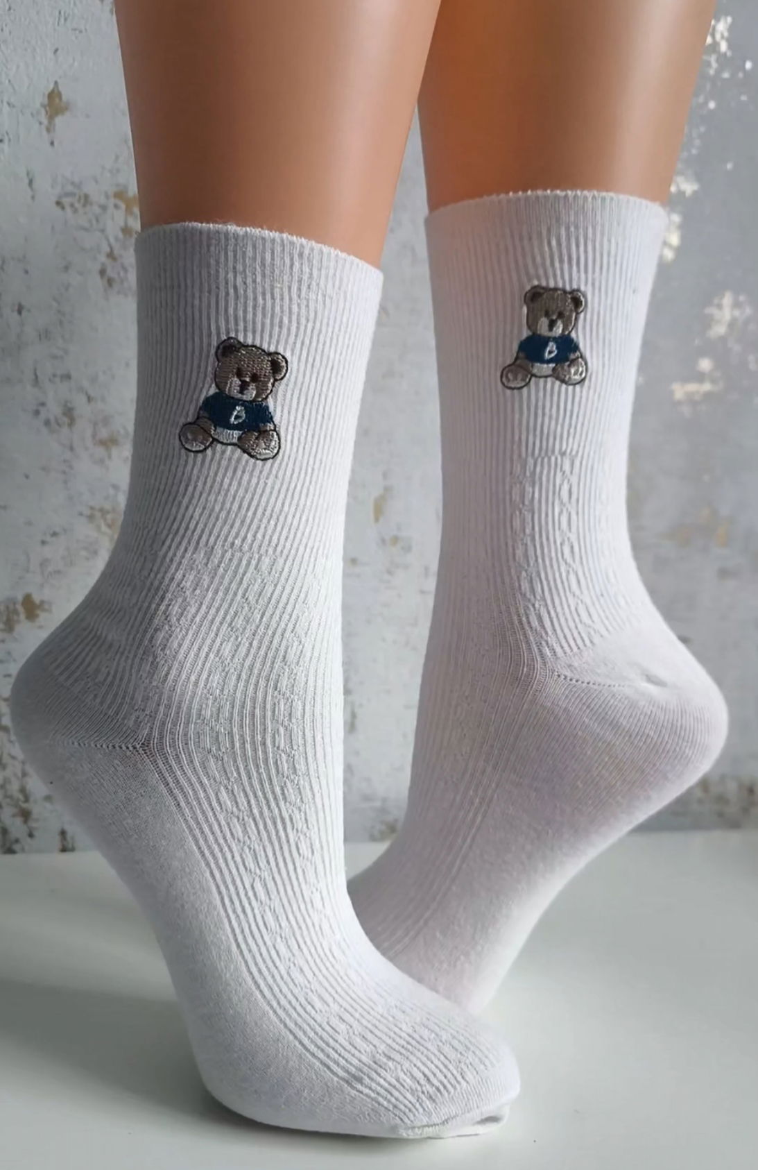 Przedstawiam Państwu skarpetki, które połączą elegancję oraz wygode. Bardzo dobra jakość materiału i staranne szycie. Gwarantują one trwałość i komfort noszenia. Model ten świetnie sprawdzi się do codziennych stylizacji. Skarpetki posiadają wyszywanego misia, każda para posiada inny jego wzór.