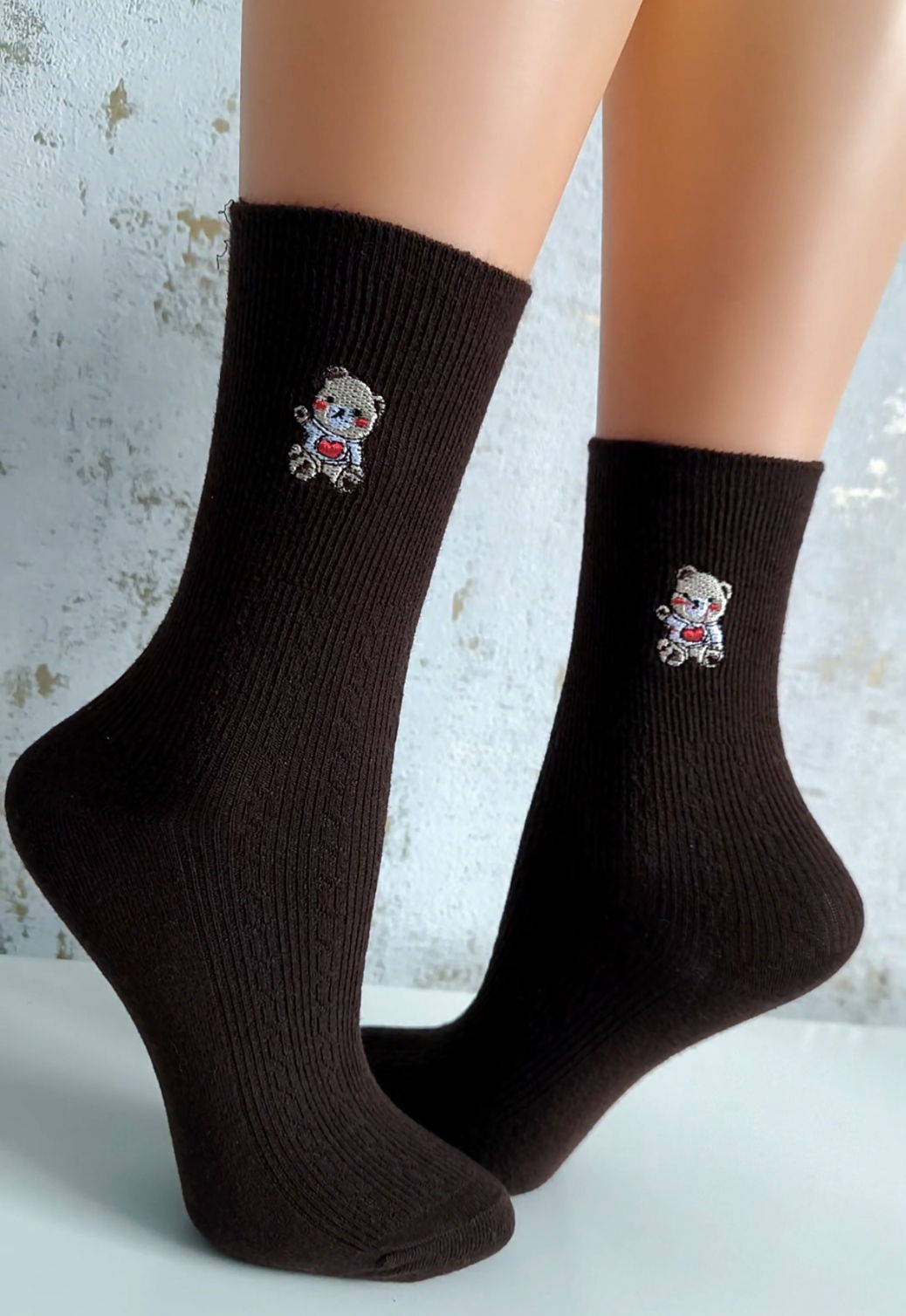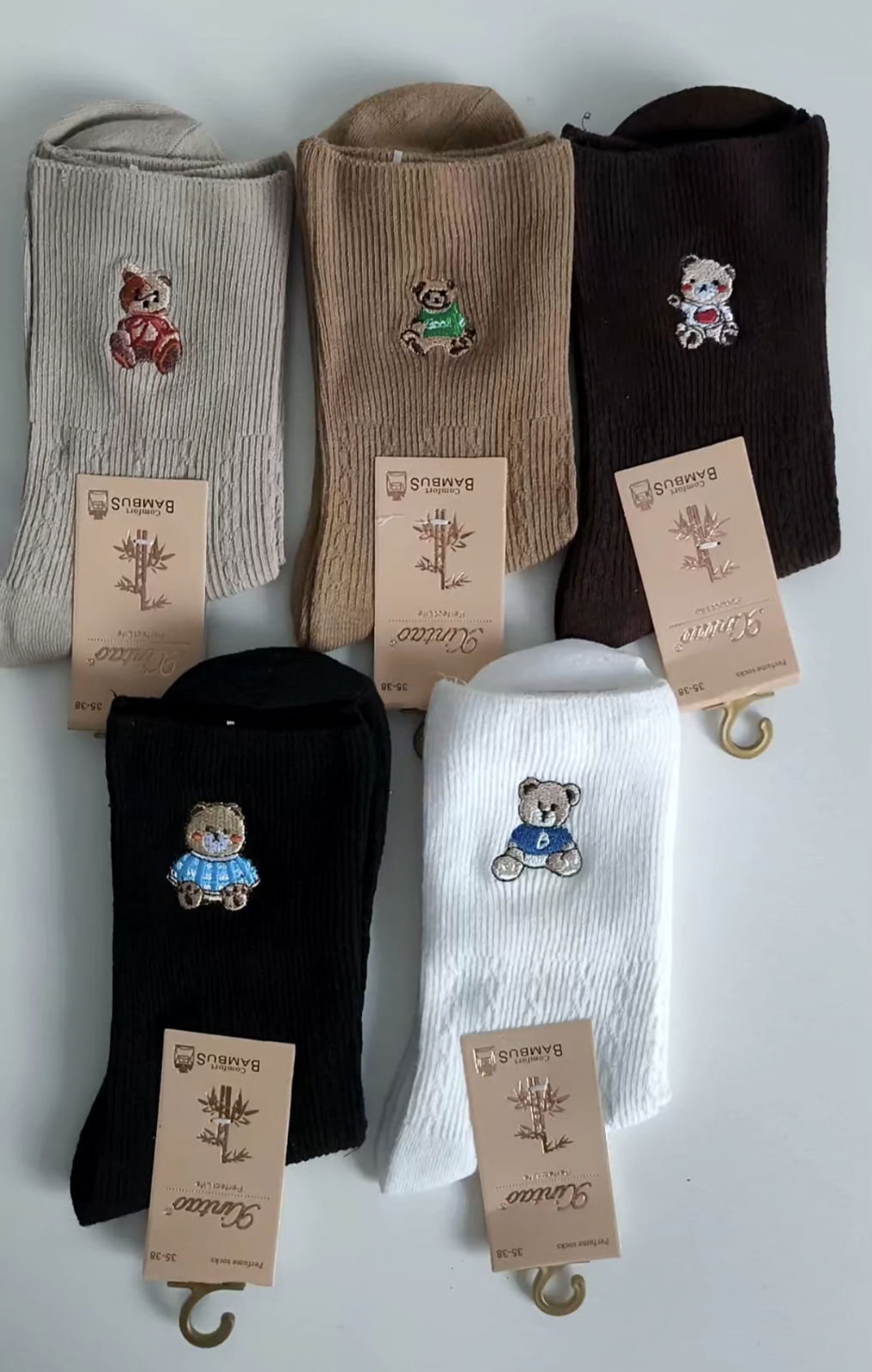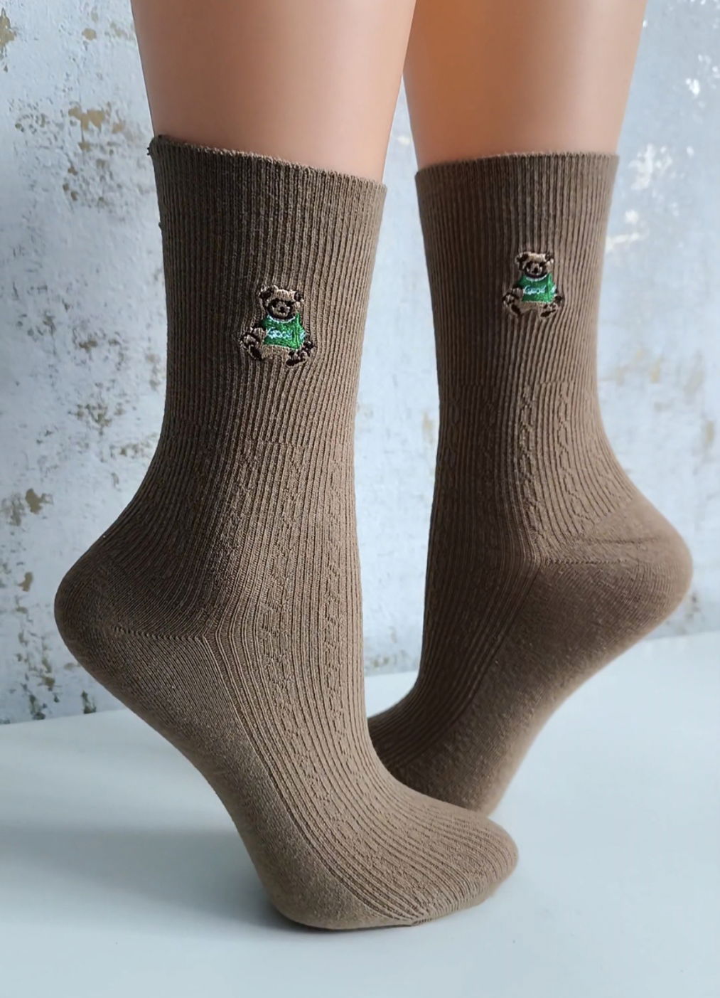 Przedstawiam Państwu skarpetki, które połączą elegancję oraz wygode. Bardzo dobra jakość materiału i staranne szycie. Gwarantują one trwałość i komfort noszenia. Model ten świetnie sprawdzi się do codziennych stylizacji. Skarpetki posiadają wyszywanego misia, każda para posiada inny jego wzór.