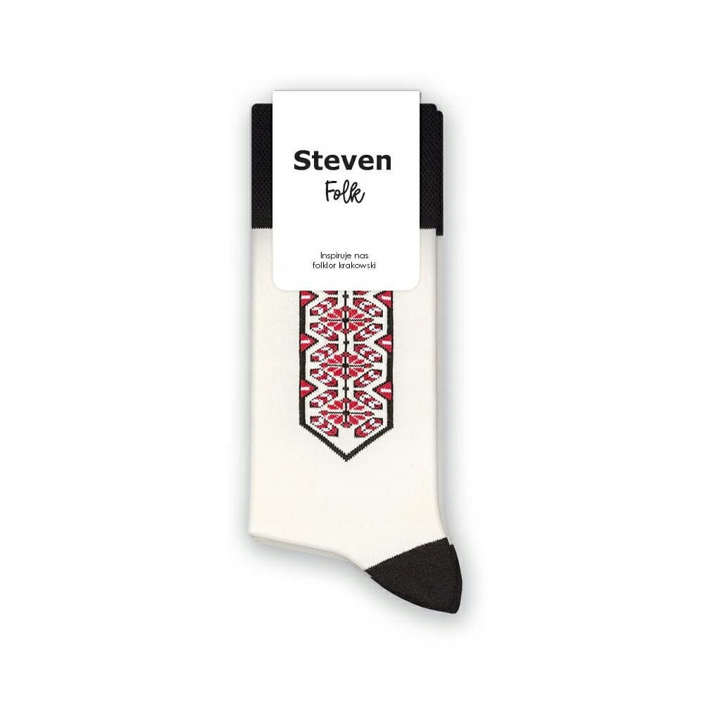 Skarpetki zdobione są tradycyjnym krakowskim wzorem w formie pionowego pasa umieszczonego na przodzie skarpetek. Wzór ten jest charakterystyczny dla regionu krakowskiego, dominują w nim kolory czerwony, czarny i biały, co nadaje skarpetkom unikalny folkowy charakter.