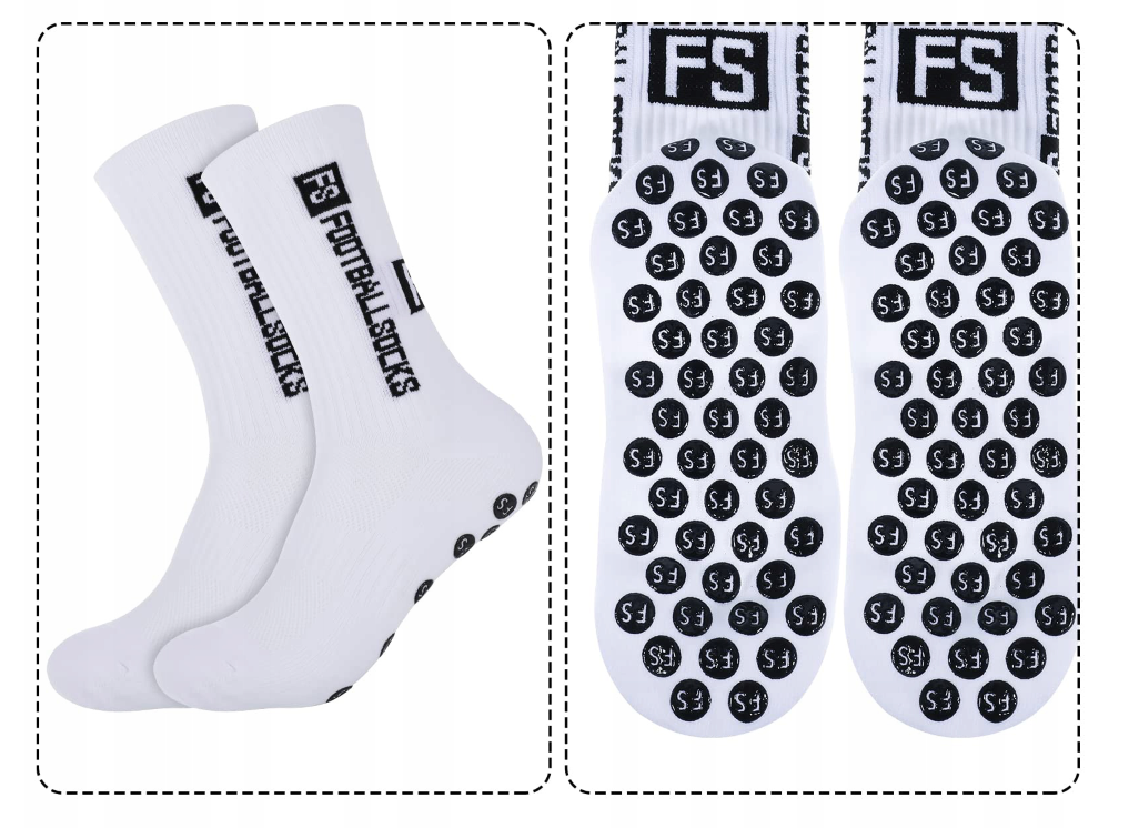Skarpety piłkarskie FS z antypoślizgowymi kropkami zapewniają doskonałą przyczepność i zwrotność. Unikalny design, rozmiar 39-45. Idealne dla entuzjastów sportu, wykonane z wysokiej jakości materiałów: chinlon i spandex. Zwiększ swoją dynamikę i przyspieszenie na boisku!