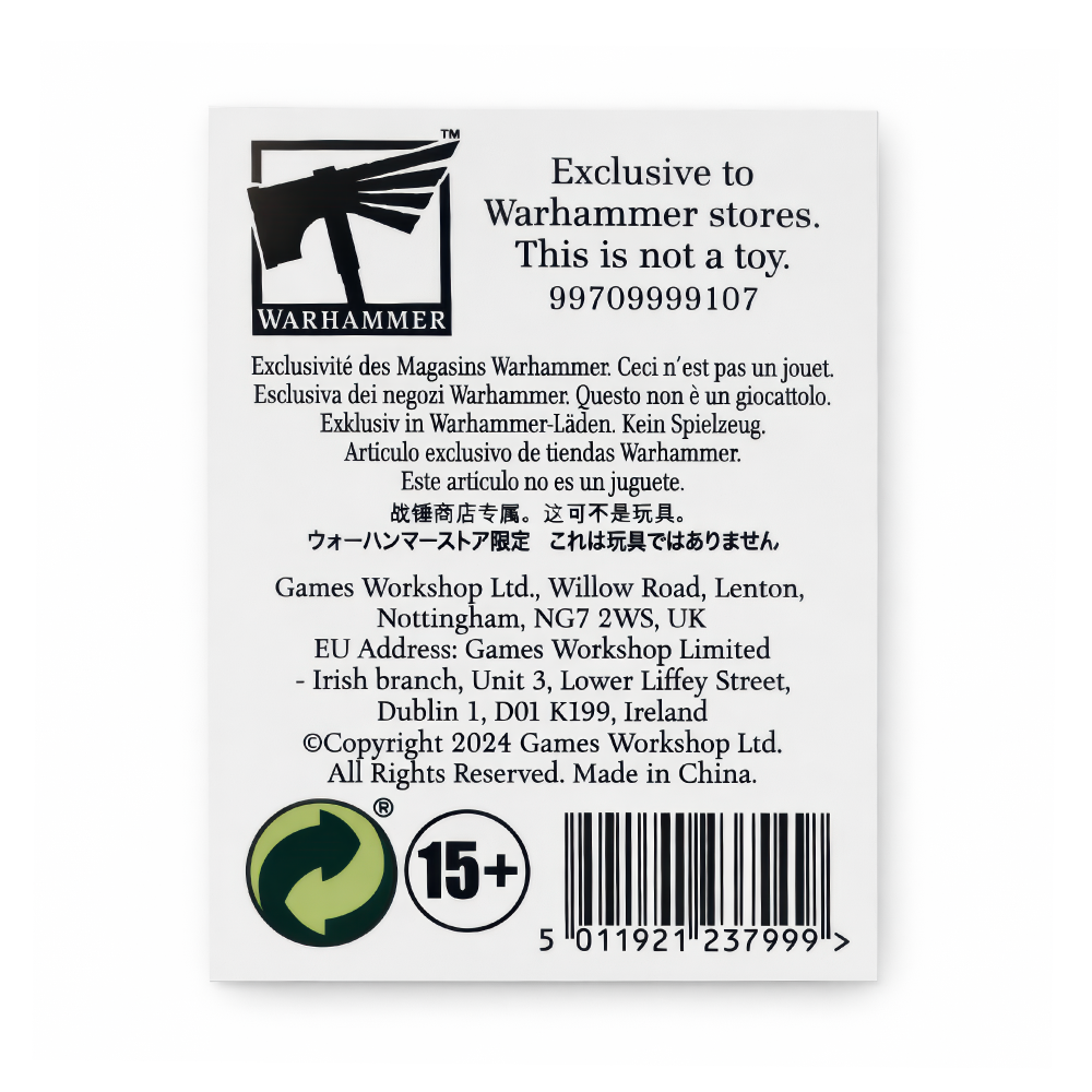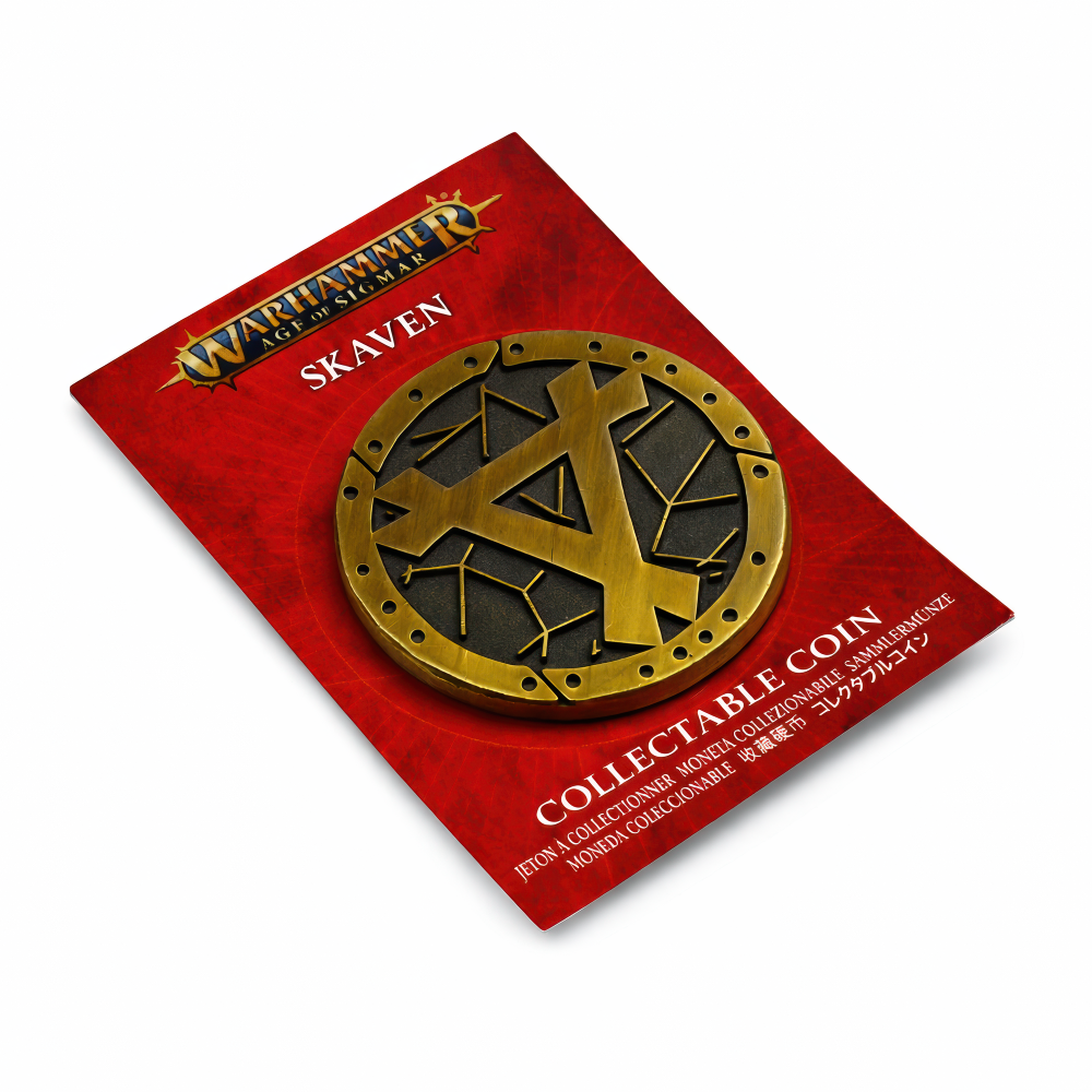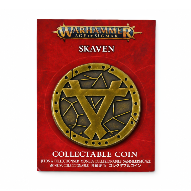 Pod jasnymi krainami Warhammera Skaveny żyją w cieniu — knują, drapią tunele i kolekcjonują spaczone trofea — a moneta Skaven to świetny, mały ukłon w stronę tej „podziemnej” dumy. Przy średnicy 32 mm to metalowy krążek, który fajnie siedzi w kieszeni, pasuje do woreczka na kości, na półkę albo na biurko hobbystyczne, i robi klimat obok walizki z armią czy cosplayu. Jeśli jarasz się ich bezczelną ambicją i zdradliwym stylem, ta moneta aż się prosi, żeby wskoczyć do Twojej kolekcji. Front gra mocnym kontrastem i wyraźnym reliefem: postarzane, mosiężno-złote tony leżą na ciemniejszym, „zużytym” tle, dzięki czemu wypukły wzór od razu wybija się w oczy. W centrum dominuje kanciasty, skaveński znak, a dookoła widać ostre, „skreślone” linie, które wyglądają jak nerwowa mapa tuneli albo spaczone ryty. Zewnętrzny pierścień ma równo rozstawione okrągłe otwory, dając wrażenie czegoś znitowanego i zrabowanego z kuźni, a sfazowane krawędzie trzymają całość schludnie w dłoni. Moneta jest na czerwonej karcie Warhammer Age of Sigmar z napisami „SKAVEN” i „COLLECTABLE COIN”; z tyłu jest znak Warhammer, tekst „Exclusive to Warhammer stores. This is not a toy.” oraz Games Workshop Ltd. i ©2024 — idealna też na prezent dla innego skaveńskiego spiskowca.