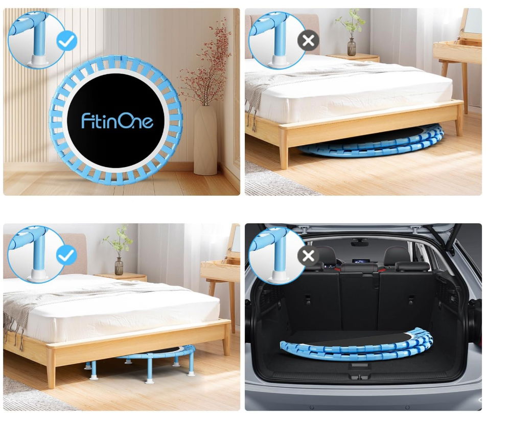 - ✴️Składana i cicha – mini trampolina FitinOne składa się do 1/4 rozmiaru, co ułatwia przechowywanie. Może zmieścić się w samochodzie, pod łóżkiem, sofą lub w szafie. Jest wyposażony w 6 zdejmowanych nóżek z gumową końcówką, aby zminimalizować hałas i chronić podłogę.