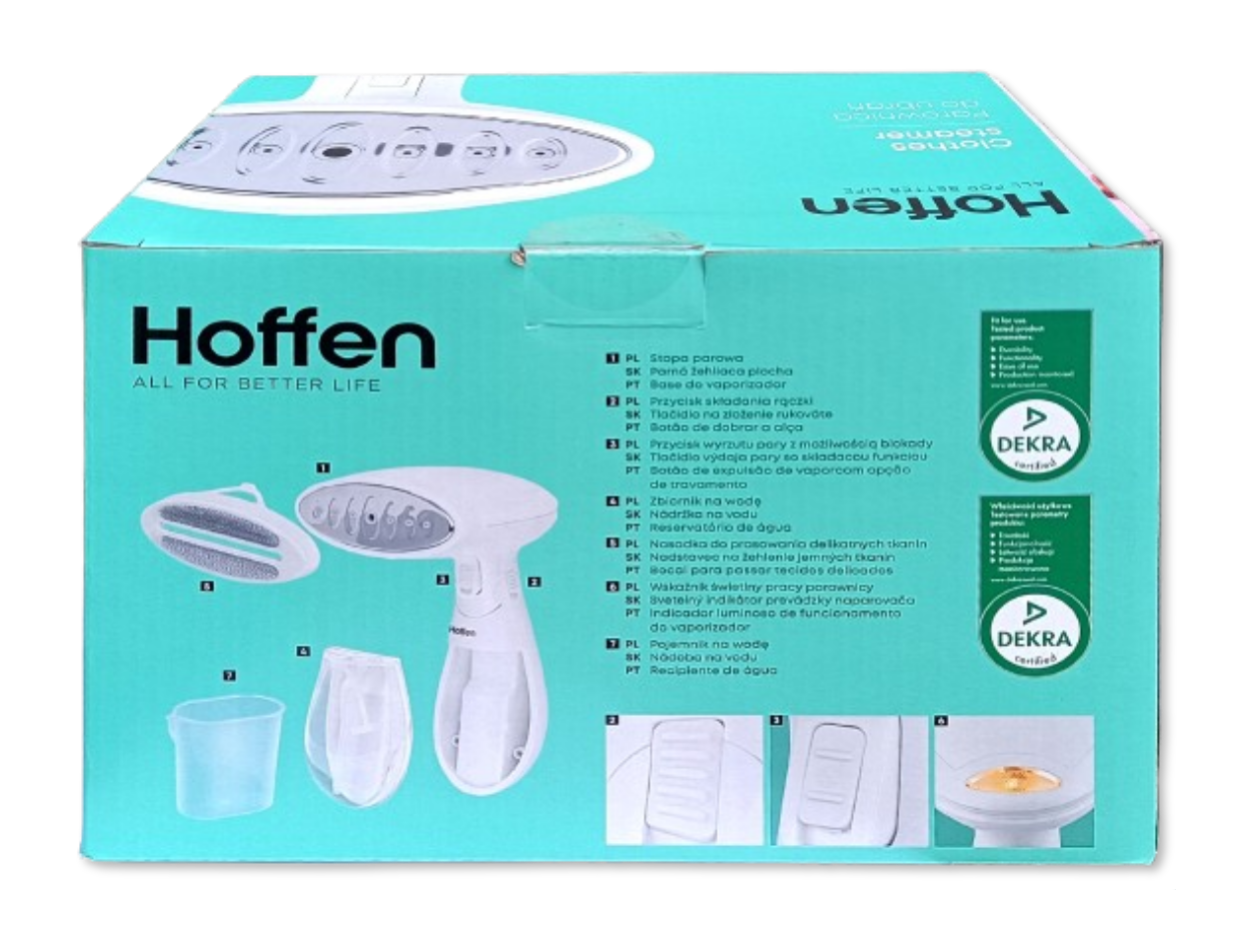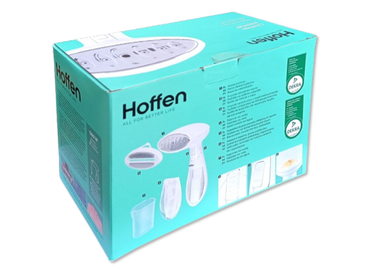 Składana parownica do ubrań marki Hoffem o mocy 1200W zapewniająca wygodne prasowanie różnych materiałów. Urządzenie posiada 7 dysz, krótki czas nagrzewania około 30s, wyposażona w wymienną nakładkę do prasowania delikatnych tkanin. Urządzenie posiada przycisk wyrzutu pary z możliwością blokady. Parownica usuwa zagniecenia i odświeża tkaniny, zaś długi 1,6 metrowy przewód pozwala na nieskrępowaną pracę. Gwarantem i importerem urządzenia jest znana wszystkim polska firma MPM.