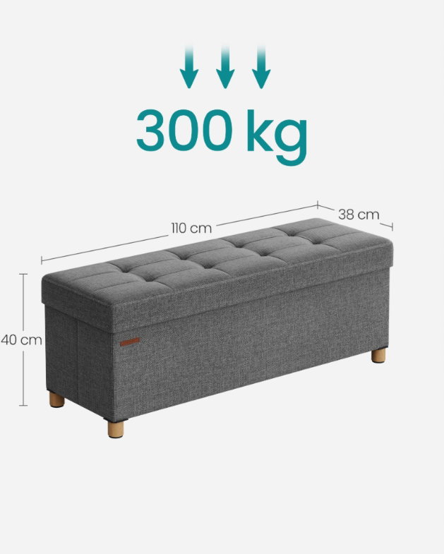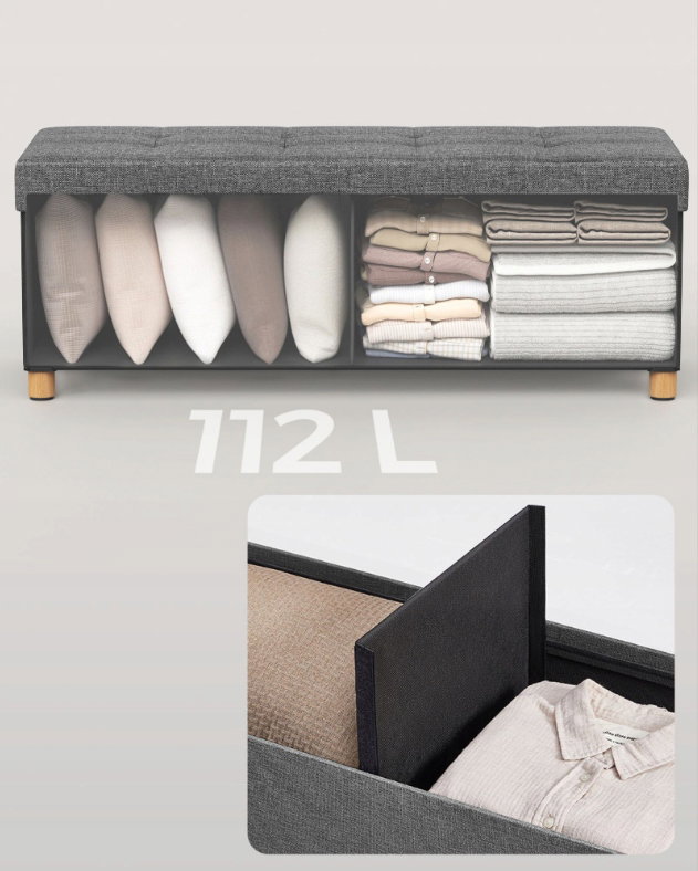 Pojemność pufy to 112 litrów, taka pojemność pozwala na przechowywanie wielu różnych przedmiotów, od ubrań i pościeli po książki, zabawki po wiele innych