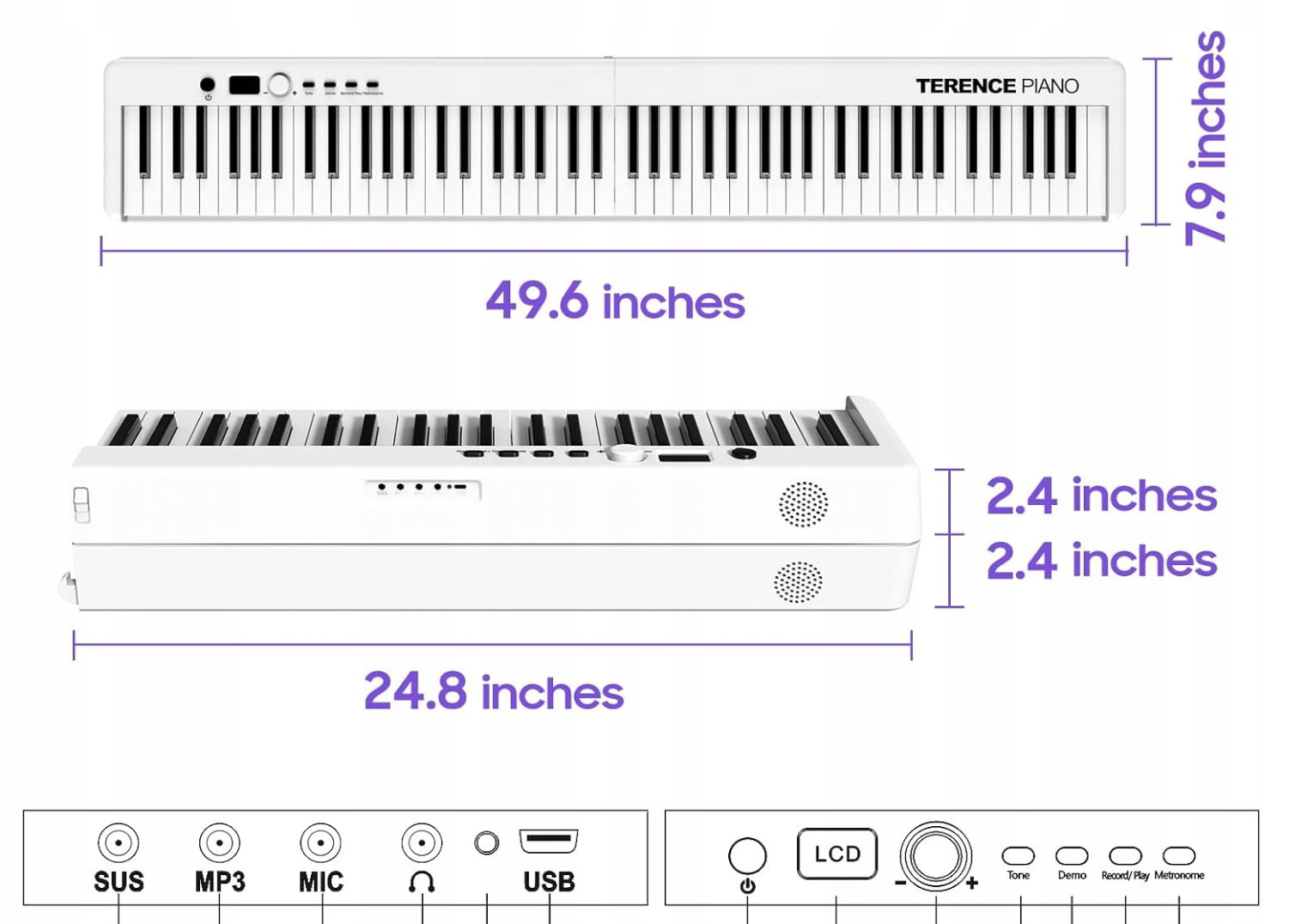 Wyposażony w wyświetlacz LCD i przycisk ułatwiający obsługę; Z metronomem, trybem uśpienia, funkcją akordów, wejściem pedału podtrzymania pedału, wyjściem słuchawkowym stereo do prywatnej ćwiczeń i wyjściami stereo do podłączenia do rejestratora, miksera lub wzmacniacza ( podtrzymujący, słuchawki i kabel AUX 3 ,5 mm w zestawie), w pełni zdolny do zaspokojenia różnych potrzeb klawiatury fortepianowej