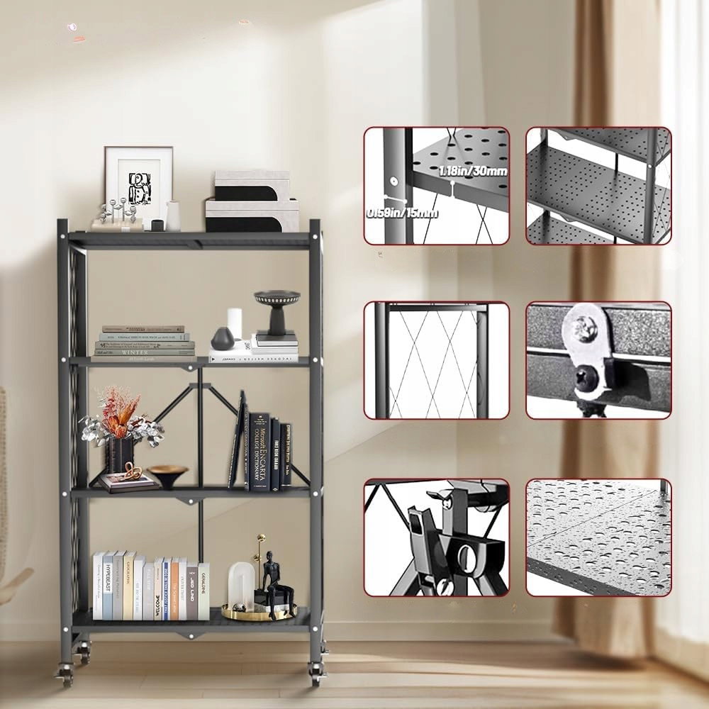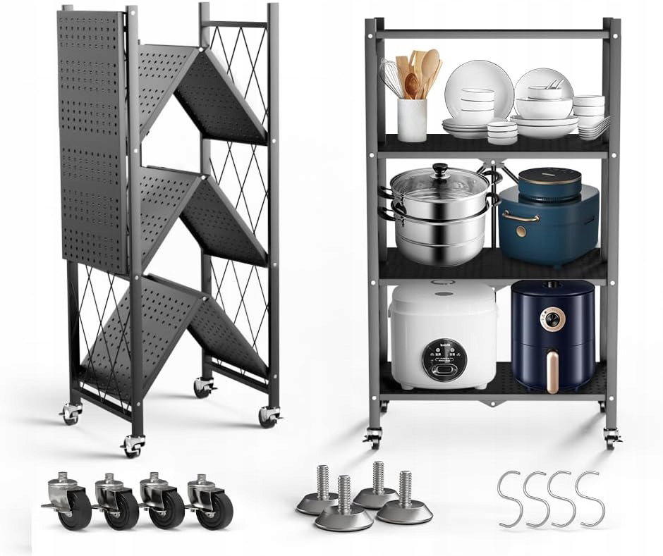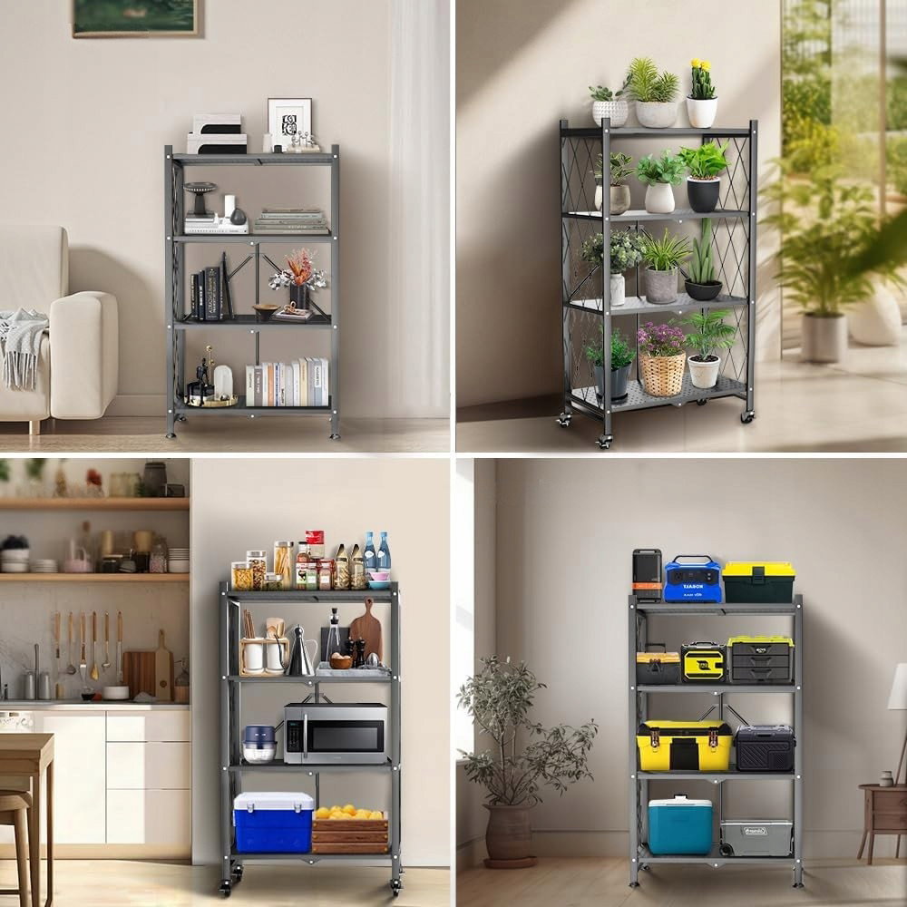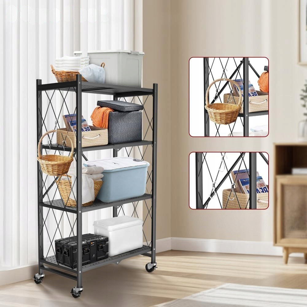 Składany regał metalowy FuGuiB na kółkach, 4-warstwowy to praktyczne rozwiązanie do przechowywania, które łączy mobilność, dużą nośność i oszczędność miejsca.