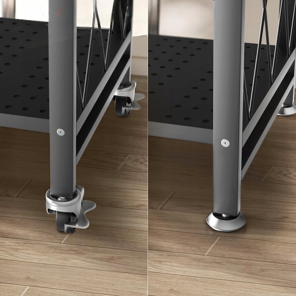 - Mobilność i składanie: cztery kółka obracające się o 360° ułatwiają manewrowanie, a dwa z nich wyposażone są w blokadę. Po złożeniu regał zajmuje niewiele miejsca i może być przechowywany w rogu lub wnęce bez konieczności demontażu.