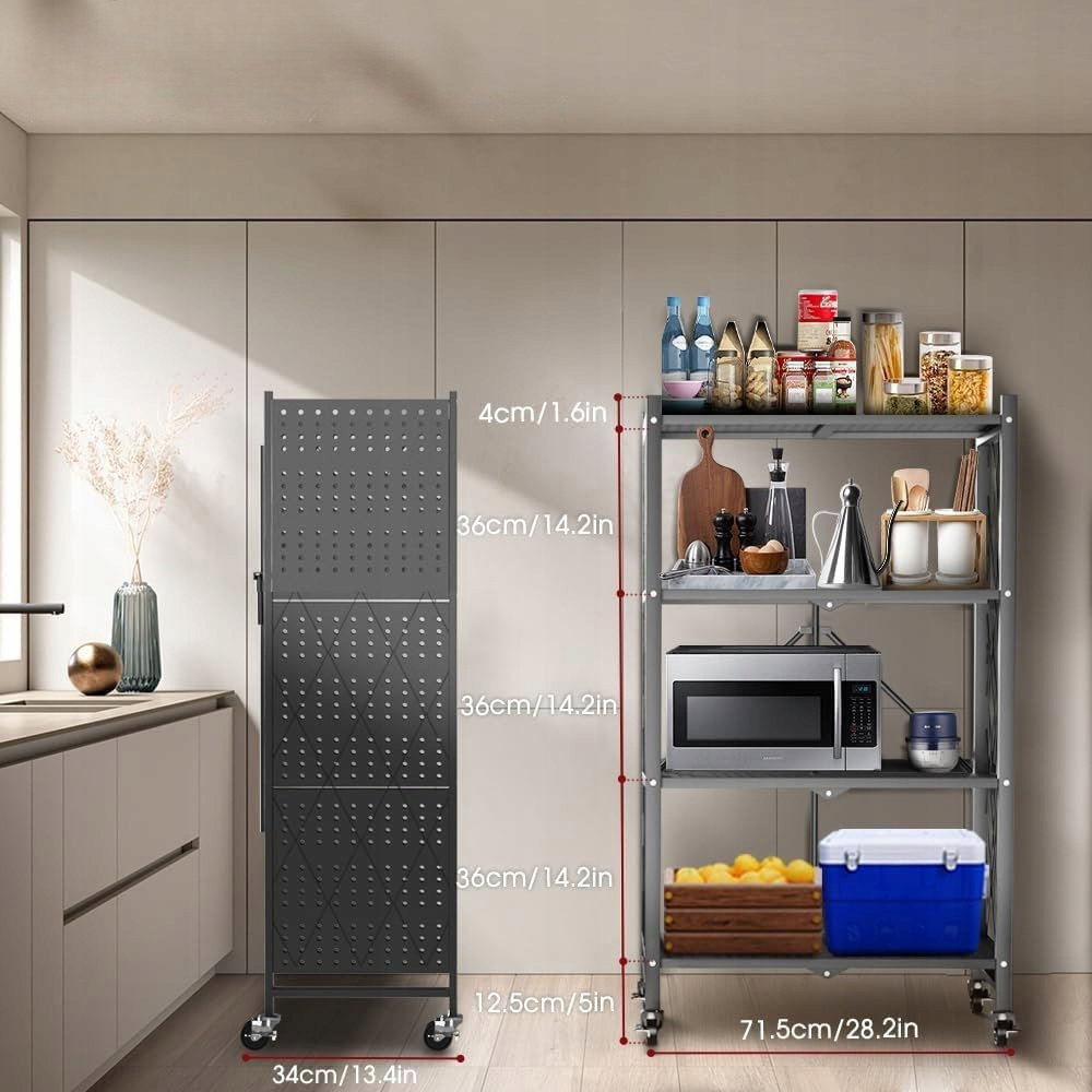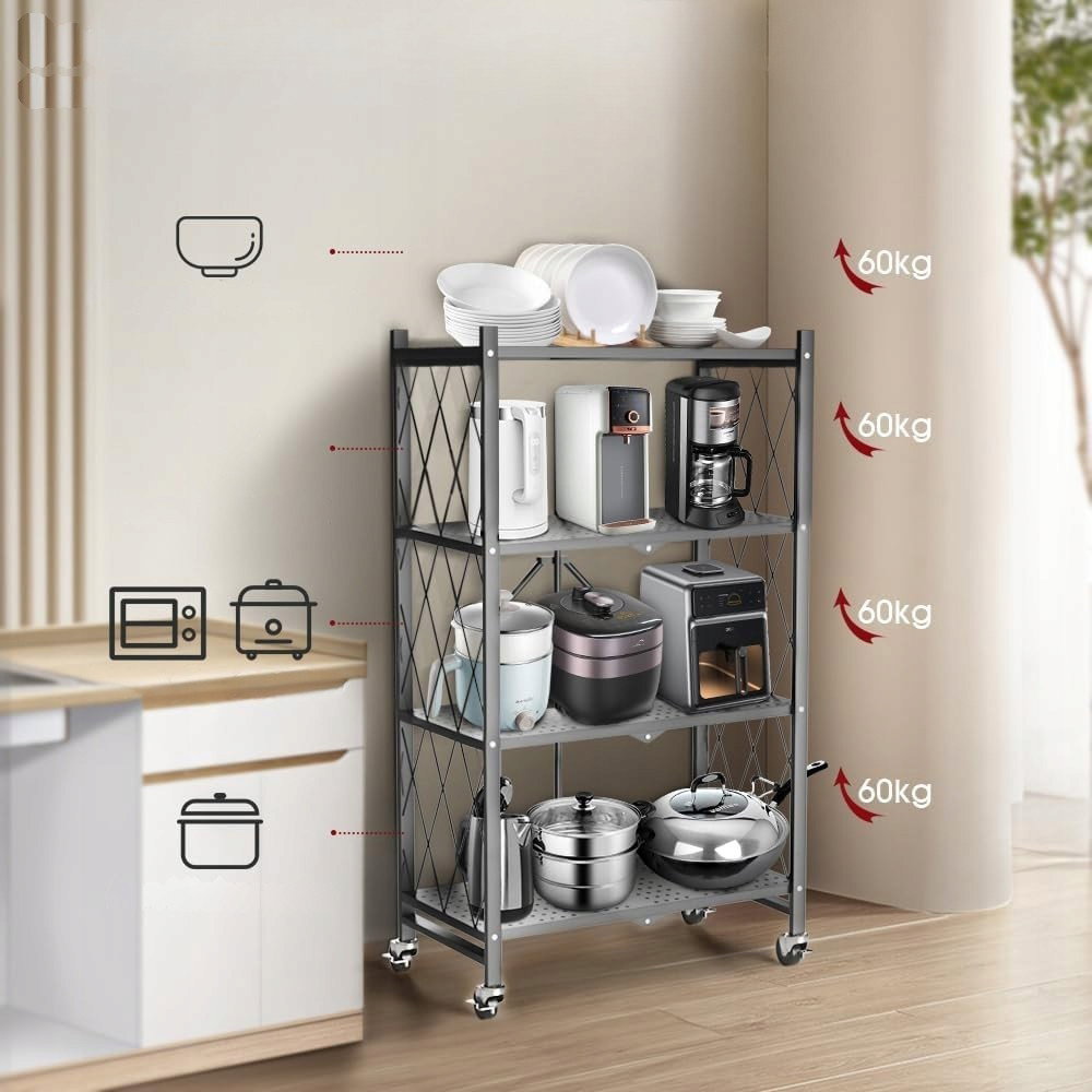 Składany regał, Składany, 4 Półki Regał z kółkami Metalowy Do kuchni SZARY
