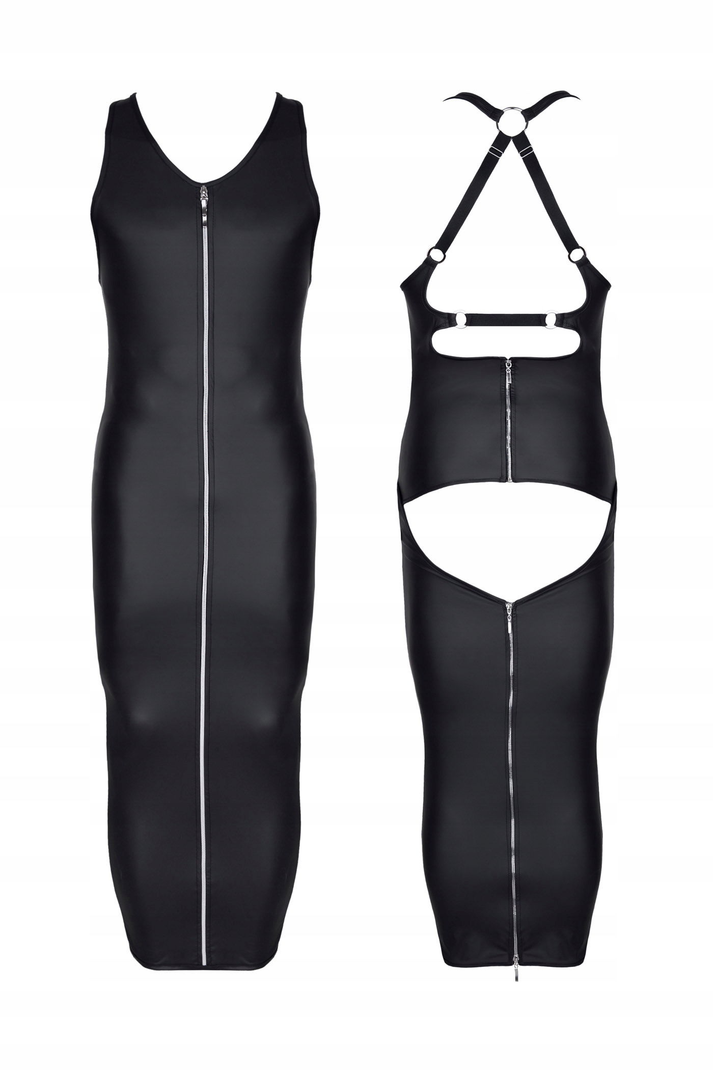 Zjawiskowo piękna i seksowna długa sukienka. W całości wykonana z miłego w dotyku i bardzo elastycznego wetlook"a 360 stopni, dzięki czemu, doskonale dopasowuje się do ciała podkreślając jego każdy detal i linię sylwetki. Z przodu na całej długości, srebrny ekspres z ozdobnymi suwakami, odpinany z dołu i z góry. Z tyłu kolejne 2 srebrne ekspresy z ozdobnymi suwakami. Suwaki z tyłu i z przodu można odpinać na różne sposoby. Dzięki temu otrzymujemy dostęp do ukrytych pod sukienką różnych części ciała. Na plecach kompozycja z czarnych, miłych w dotyku gumek oraz metalowych kółek i regulatorów. Sukienka dzięki odkrytym pośladkom, licznym ekspresom zaprasza do intrygujących i pikantnych prowokacji. Pobudza wyobraźnię, kreatywność i zachwyca jakością wykonania.