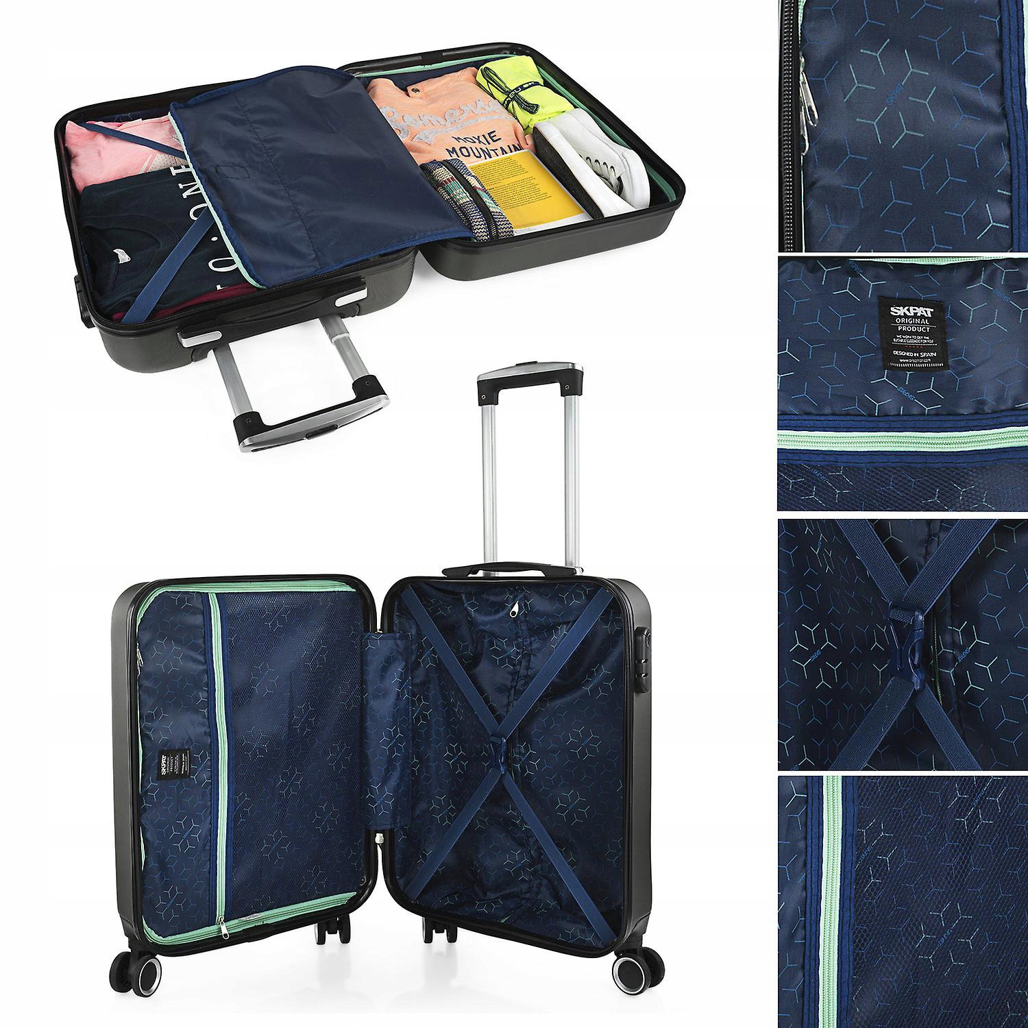 Mocny, lekki i wytrzymaly bagaz podreczny z wysuwanym górnym uchwytem i walizka podrózna z kólkami i zamkiem szyfrowym.