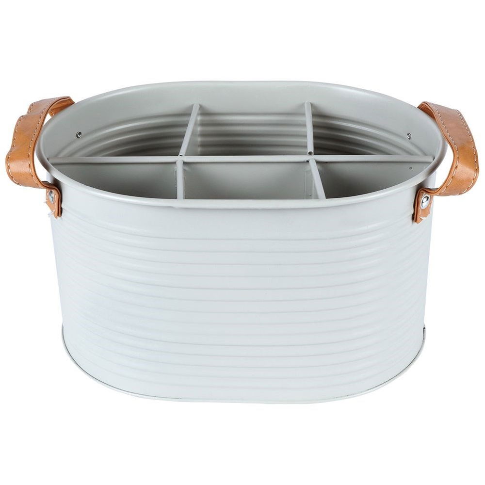 SOLIDNA - Wykonana z metalu w jasnoszarym kolorze. Ryflowana powierzchnia zewnętrzna nawiązuje do aktualnych trendów. Posiada skórzane uchwyty w kolorze brązowym.