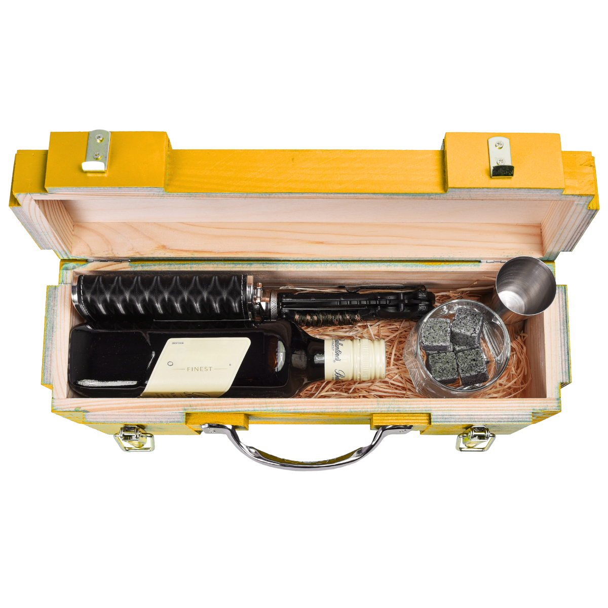 Skrzynka, która doskonale komponuje się z butelką Balantines 0,5l, pomieści wszystkie dodatki: