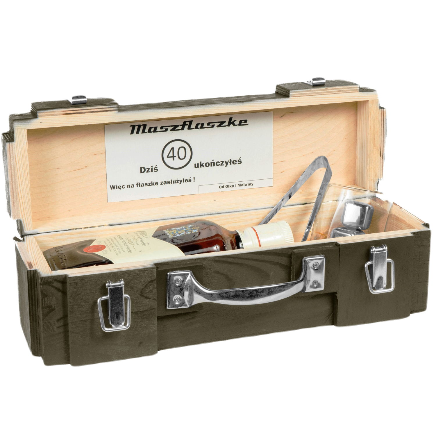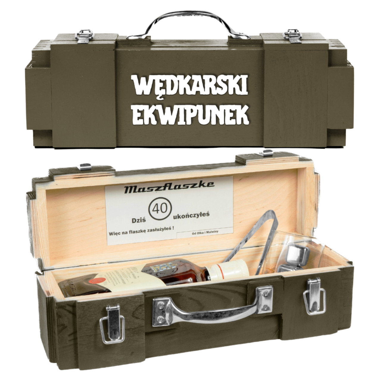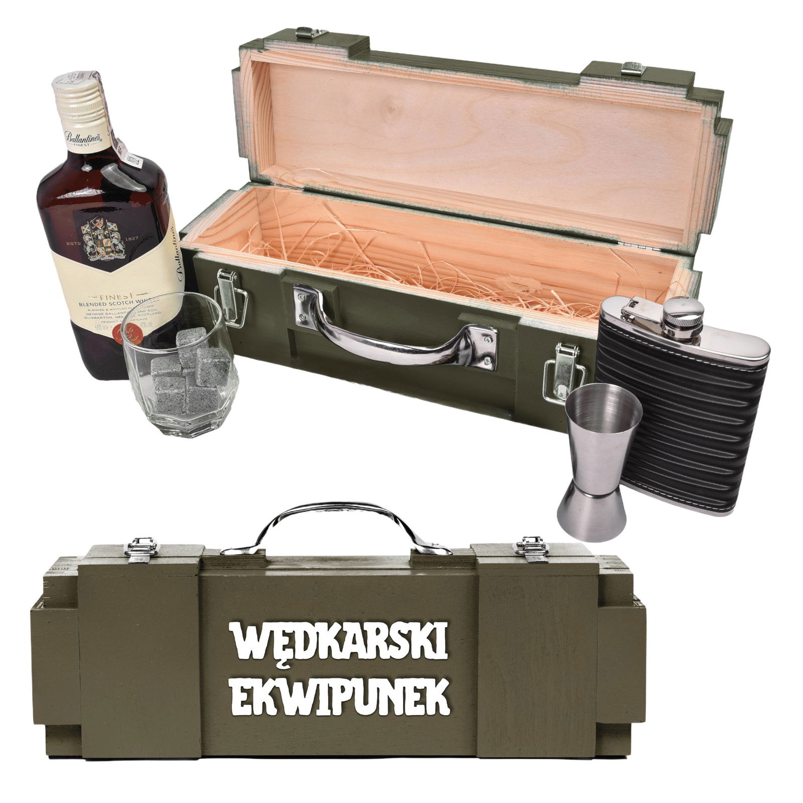 Skrzynka WĘDKARSKI EKWIPUNEK + piersiówka + whisky stones + szklanka + kieliszek