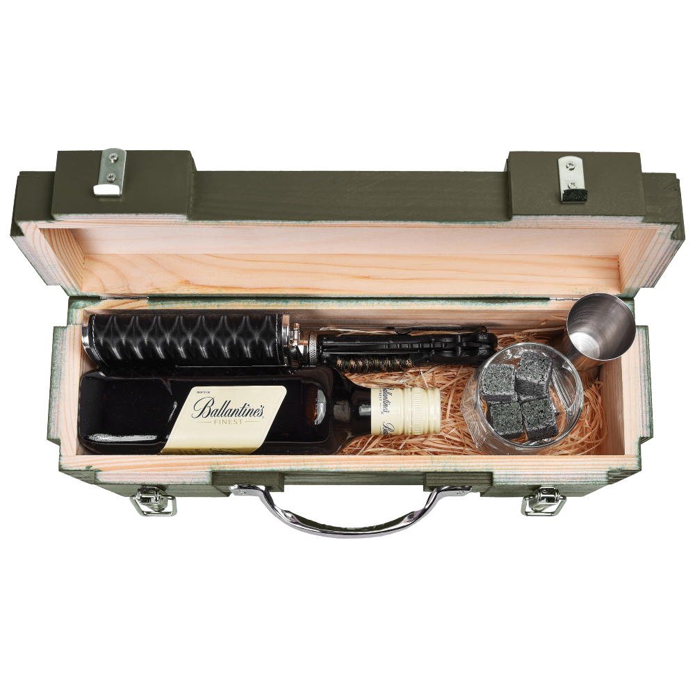 Skrzynka, która doskonale komponuje się z butelką Balantines 0,5l, pomieści wszystkie dodatki: