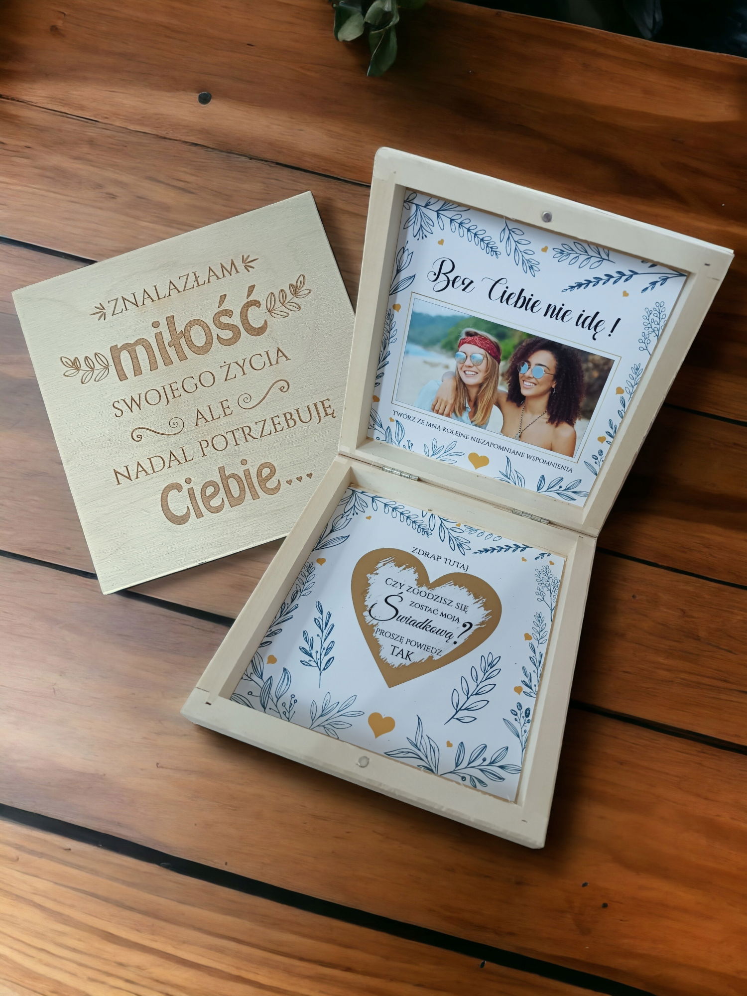 Oferujemy Państwu pytanie dla Świadkowej w oryginalnej formie pudełeczka z grawerem. Pozwala w oryginalny sposób poprosić wybraną osobę o sprawowanie tej zaszczytnej funkcji.Wewnątrz znajdują się nadrukowane kartki, na jednej umieszczone jest zdjęcie, na drugiej zdrapka. Całość ma nietypową formę, będzie wspaniałą pamiątką.