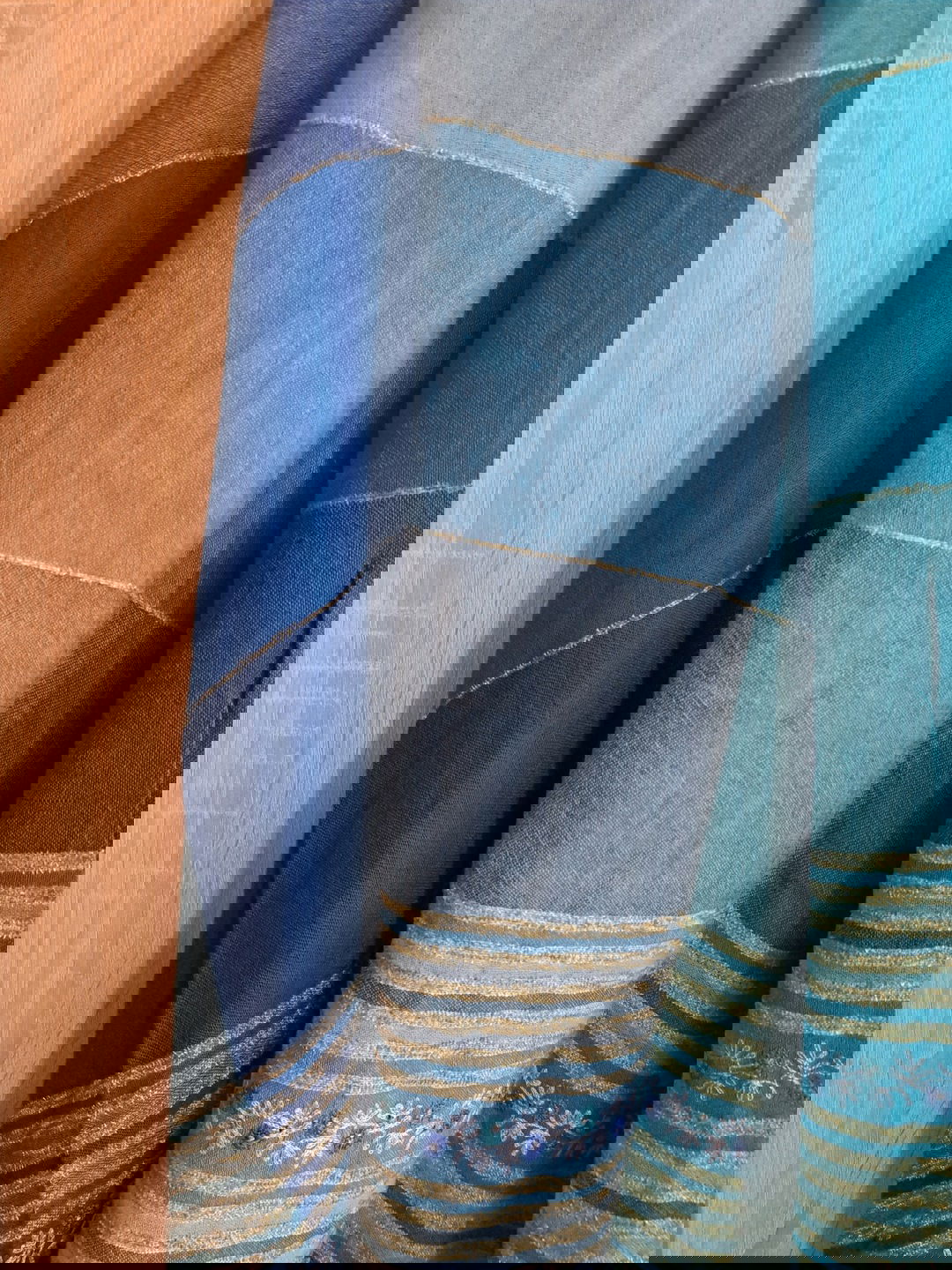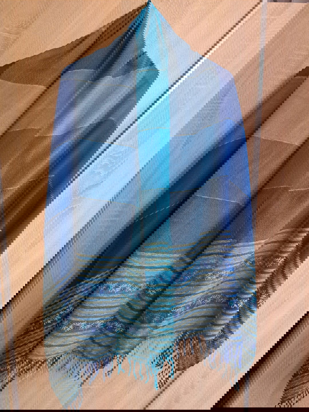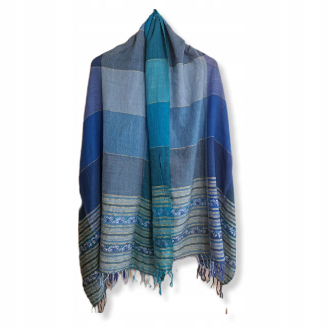 Śliczny wełniany szal w odcieniach turkusu i niebieskiego cienka wełna