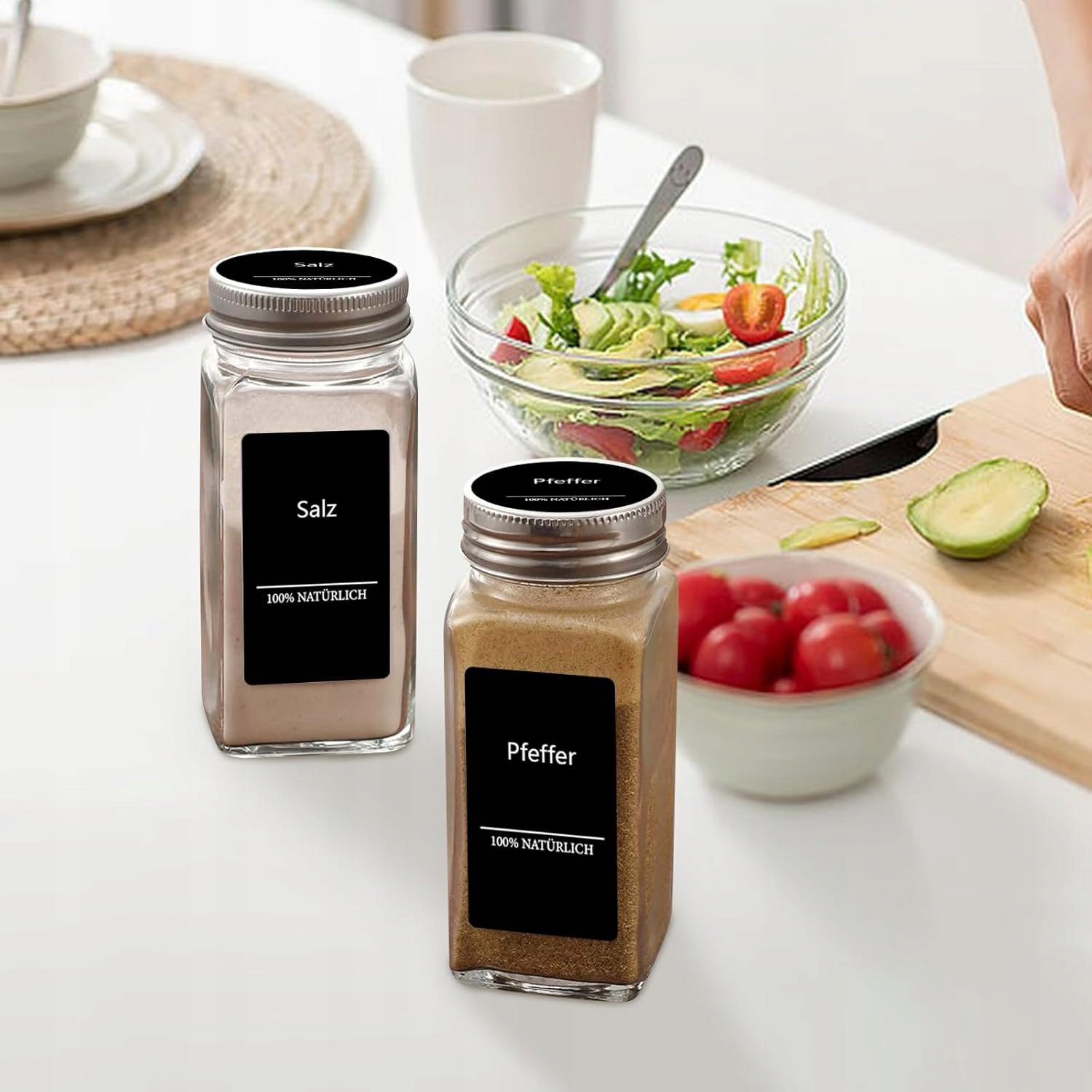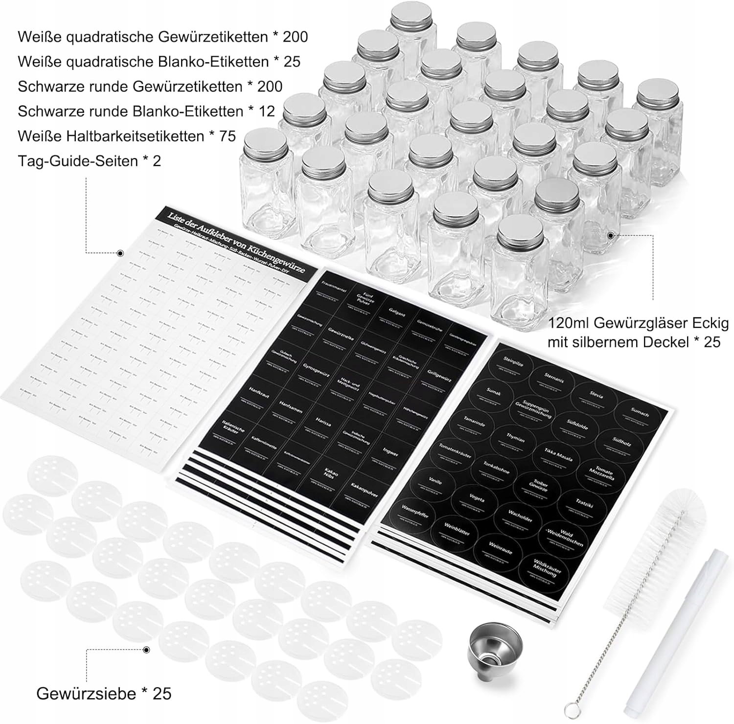 【25 słoików na przyprawy ze wszystkimi akcesoriami】 - W tym zestawie znajduje się 25 wysokiej jakości kwadratowych słoików na przyprawy, 25 sztuk sitek do przypraw, 512 etykiet na przyprawy, zawiera większość nazw przypraw, puste etykiety i etykiety daty, metalowy lejek, biały długopis, a także szczoteczkę do czyszczenia.