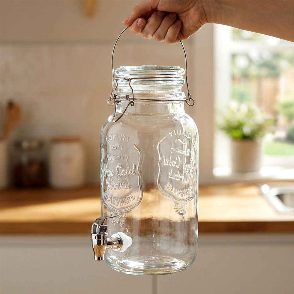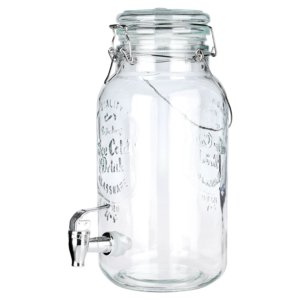 Słój z kranikiem do napojów - Dystrybutor do napojów z kranikiem o pojemności 4 l. Idealny do serwowania lemoniady w gorące dni, ponczu lub soku podczas imprezy. Słój ma wymiary zewnętrzne 22 x 14 x 32 cm.
