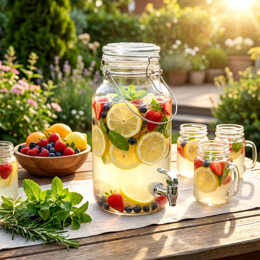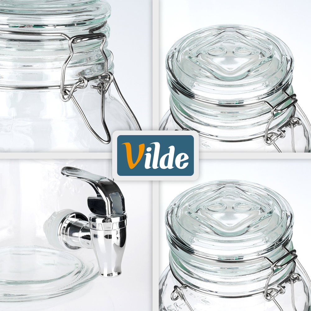 Szklany dystrybutor z kranikiem idealny do serwowania wody, lemoniady, soku, herbaty mrożonej, wody smakowej, ale również ponczu. Dzięki kranikowi w łatwy sposób zaserwujemy ulubione napoje w sposób efektowny. Słój wykorzystamy zarówno w ogrodzie, jak i podczas spotkań rodzinnych. Nie nadaje się do napojów gorących.