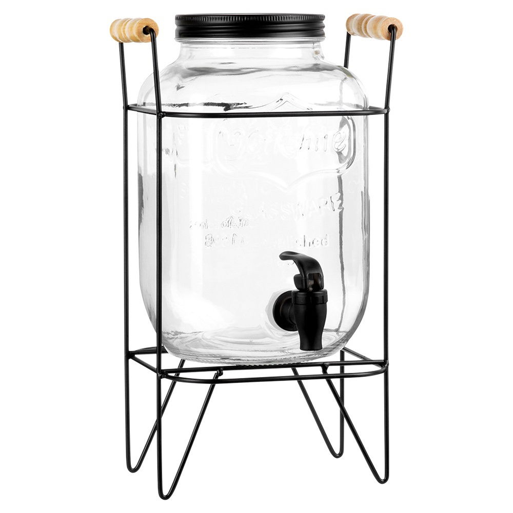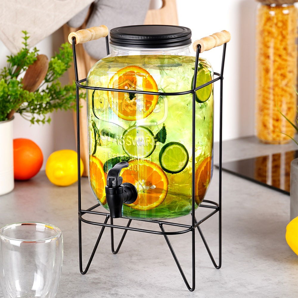 IDEALNY DO NAPOJÓW - Dystrybutor do napojów z kranikiem o pojemności 4,2 l w zestawie ze stojakiem. Słój ma wymiary: 19 x 15 x 25 cm. Stojak ma wymiary: 17,5 x 20 x 34 cm. Całkowity wymiar zestawu, czyli stojaka z postawionym na nim słojem z kranikiem wynosi 23 x 20 x 34 cm. Idealny do serwowania lemoniady w gorące dni, ponczu lub soku podczas imprezy.