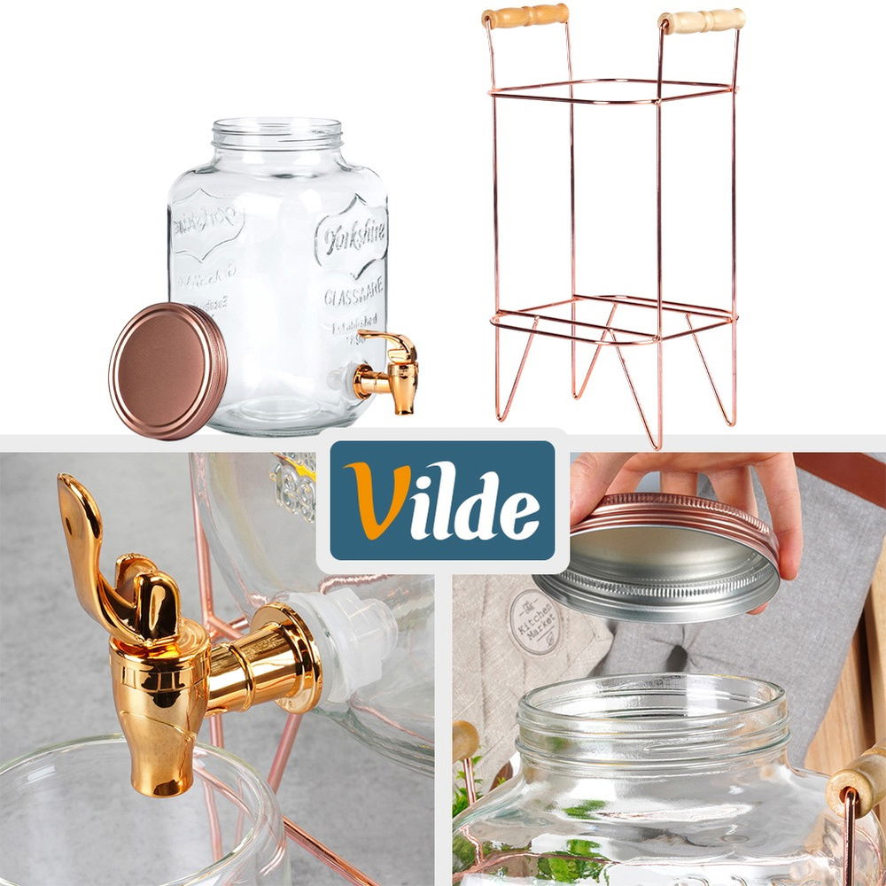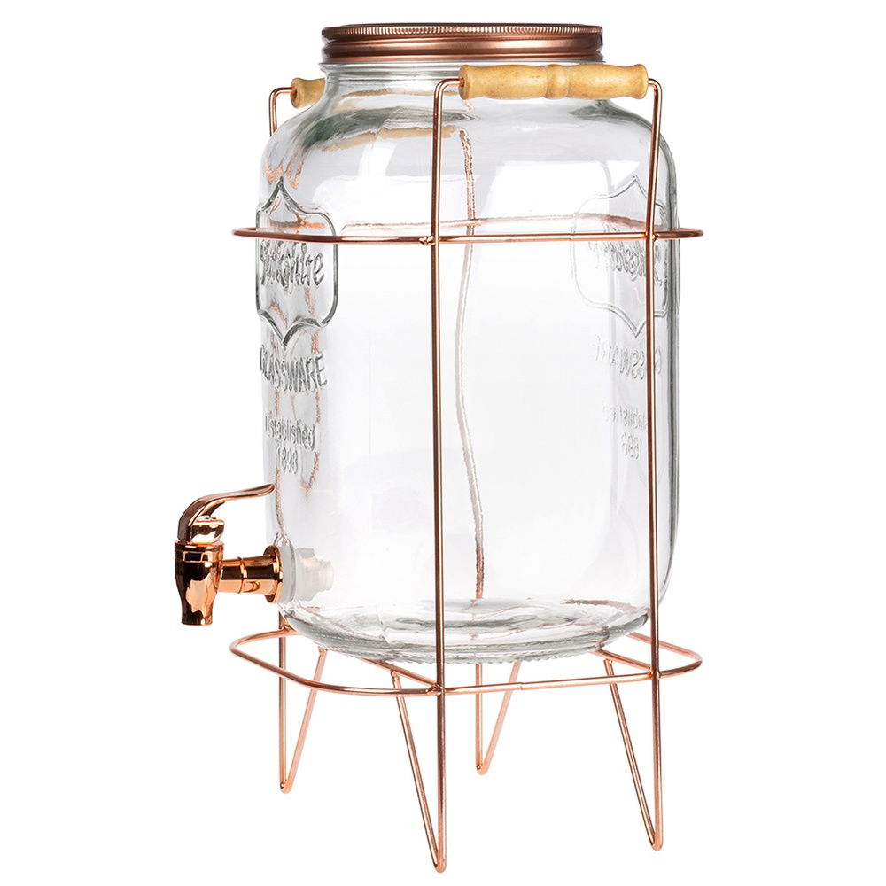 Wykonany z grubego szkła - Słój wykonany z najwyższej jakości grubego szkła. Posiada tłoczone napisy, które prezentują się efektownie. Stojak wykonany jest z najwyżej jakości metalu w kolorze różowego złota, posiada uchwyty wykonane z drewna, a kranik wykonany jest z tworzywa w kolorze różowego złota.