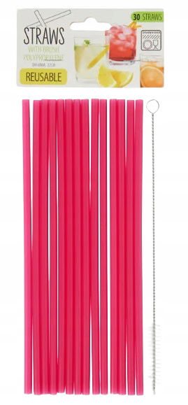 Zestaw 30 plastikowych słomek z czyścikiem. Słomki wielorazowego użytku. Sprawdzą się świetnie jako ozdoba napojów zarówno na przyjęciach dla dzieci, jak i dorosłych. Słomki można wykorzystywać wielokrotnie, można myć je w zmywarce bądź za pomocą czyścika.