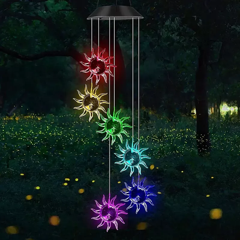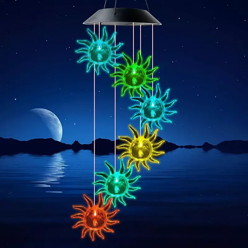 Solarne słoneczka zestaw 6 słońc dzwonków, długości ozdoby ponad 60 cm, przeznaczonych do powieszenia w dogodnym miejscu. Lampka ozdobna wodoodporna przeznaczona do dekoracji ogrodu, balkonu, patio. Słoneczka wykonane ze szkła akrylowego i na wietrze, delikatnie dzwonią gdy wpadają na siebie. Po zmroku słoneczka zmieniają kolor alternatywnie między czerwonym, zielonym, pomarańczowym, niebieskim, żółtym, fioletowy i biały, jeden kolor stopniowo przechodzi w inny, tworząc surrealistyczny efekt wizualny, dodaje uroczy efekt kolorowych świateł i sprawia, że otoczenie wygląda marzycielsko i magicznie z pewnością będą idealne do dekoracji sypialni, patio, balkonu, okna lub ogrodu. Cechy: