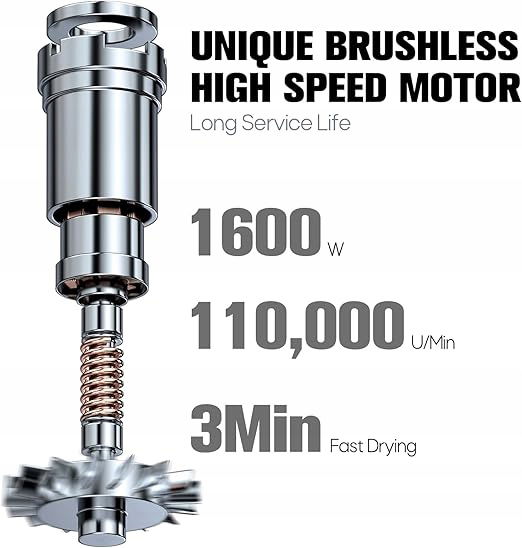 - Szybkie suszenie: Dzięki potężnemu silnikowi o mocy 1600W i obrotach sięgających aż 110,000 obr./min, Twoje włosy będą suche w zaledwie 2 minuty! Idealna opcja dla zabieganych osób.